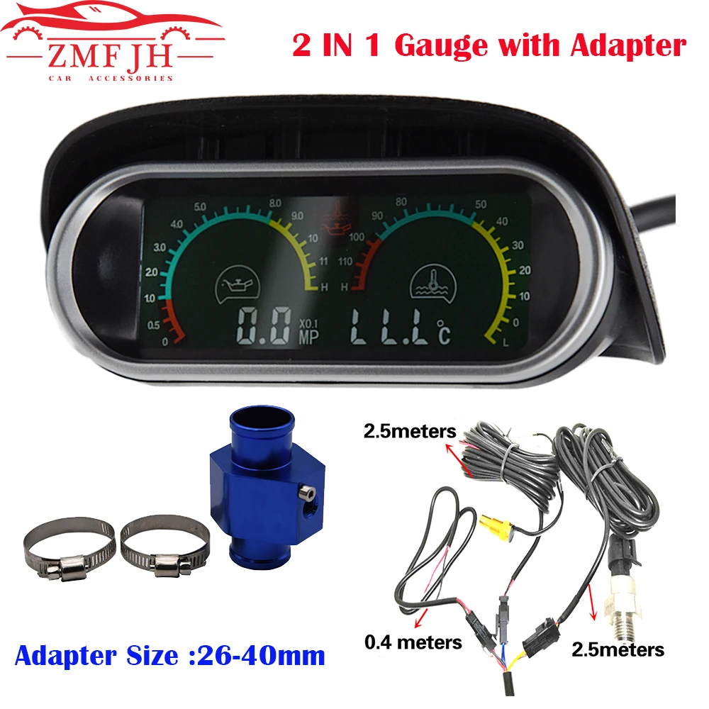 -Название: Автомобильный ЖК-дисплей 2 в 1 датчик (температура воды/давление масла)-датчик температуры воды винт: M10 (1/8 NPT) -датчик давления масла: 1/8 NPT-Размер адаптера: 26 мм-40 мм-Источник питания: 9 В постоянного тока-36 в-подходит для автомобиля 12 В, 24 В (9-36 в) универсальный.