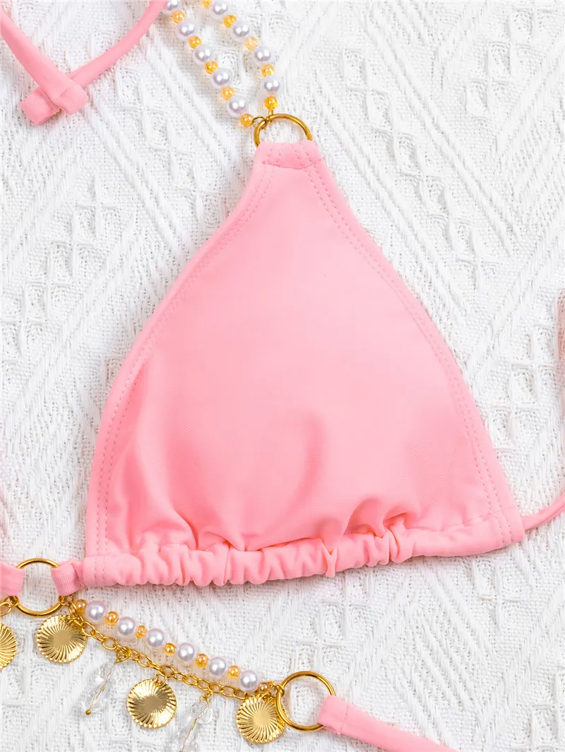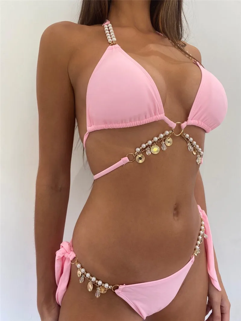 Пикантные бикини для женщин, летние лоскутные треугольные купальники с кристаллами, мягкий бюстгальтер пуш-ап, стринги, однотонные с лямкой на шее, купальные костюмы для пляжа, 2 шт.