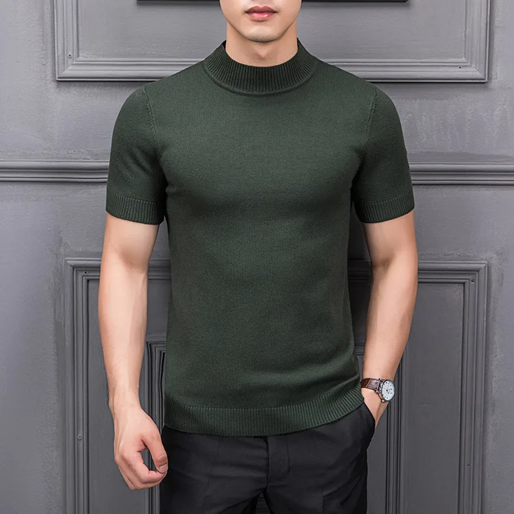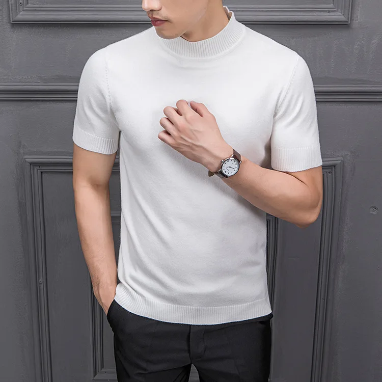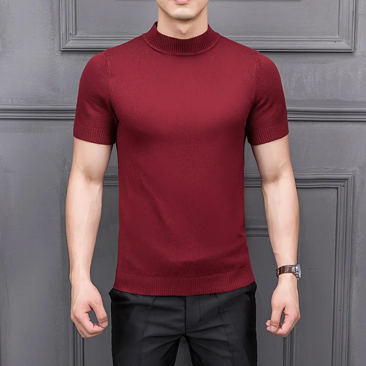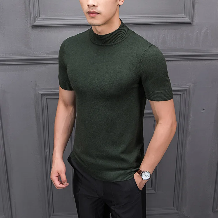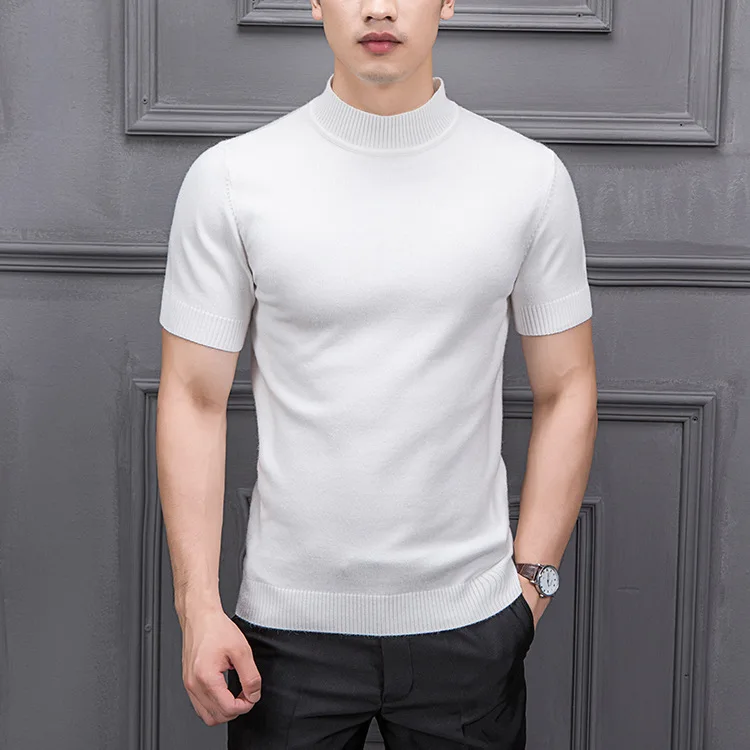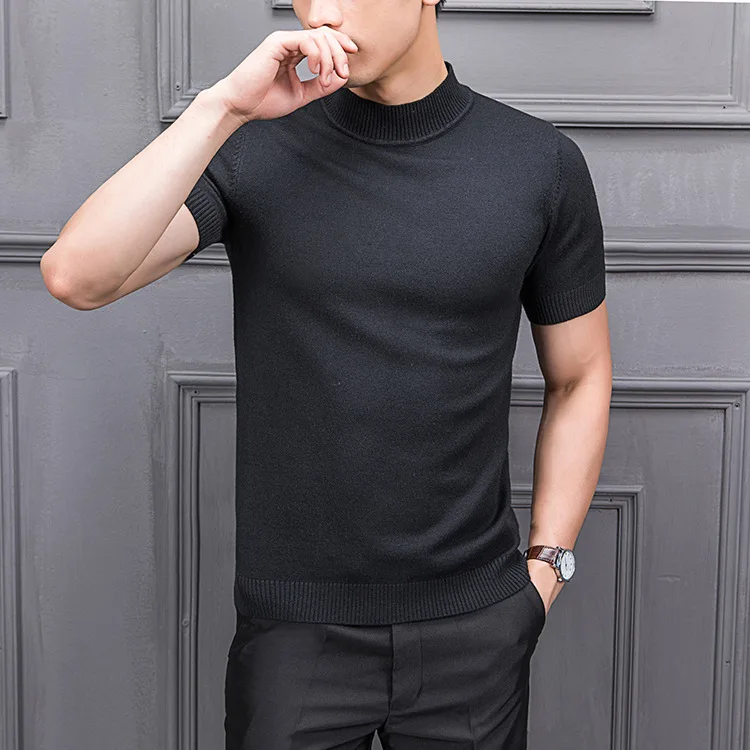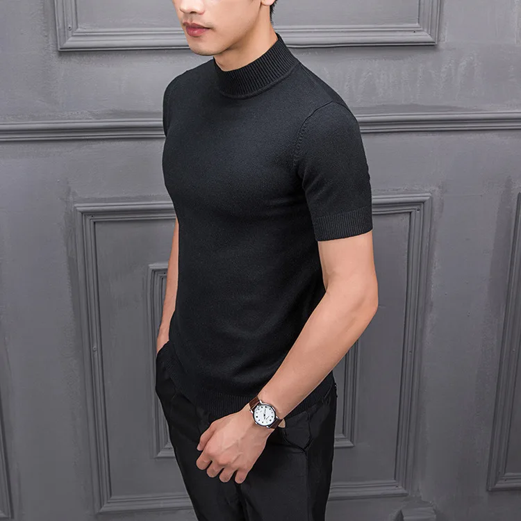 Мужская хлопковая футболка, свитер, однотонная водолазка с высоким воротником, высокое качество, трикотажная Повседневная футболка с коротким рукавом