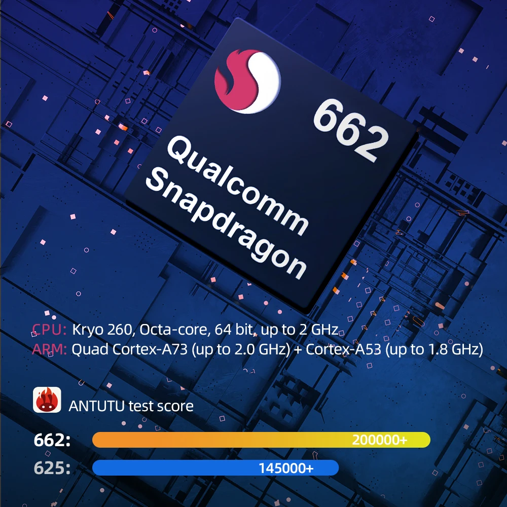 >>> ЦП - это процессорный чип Qualcomm Snapdragon 662, работающий быстрее и стабильнее, с лучшим рассеиванием тепла, будет наслаждаться плавным использованием приложений