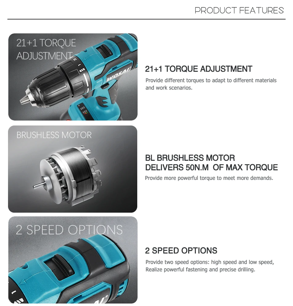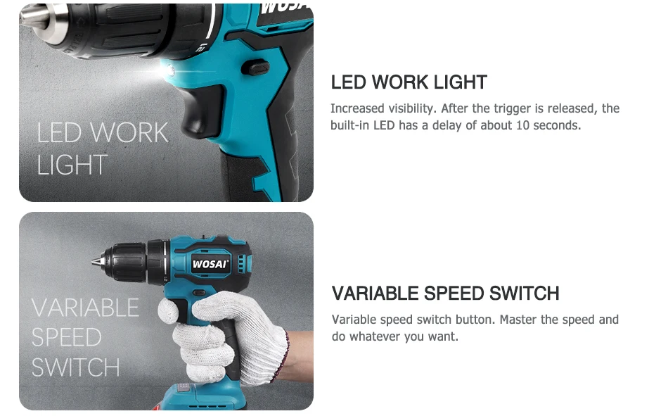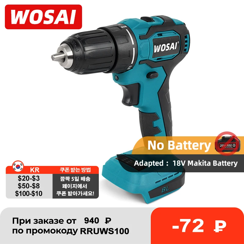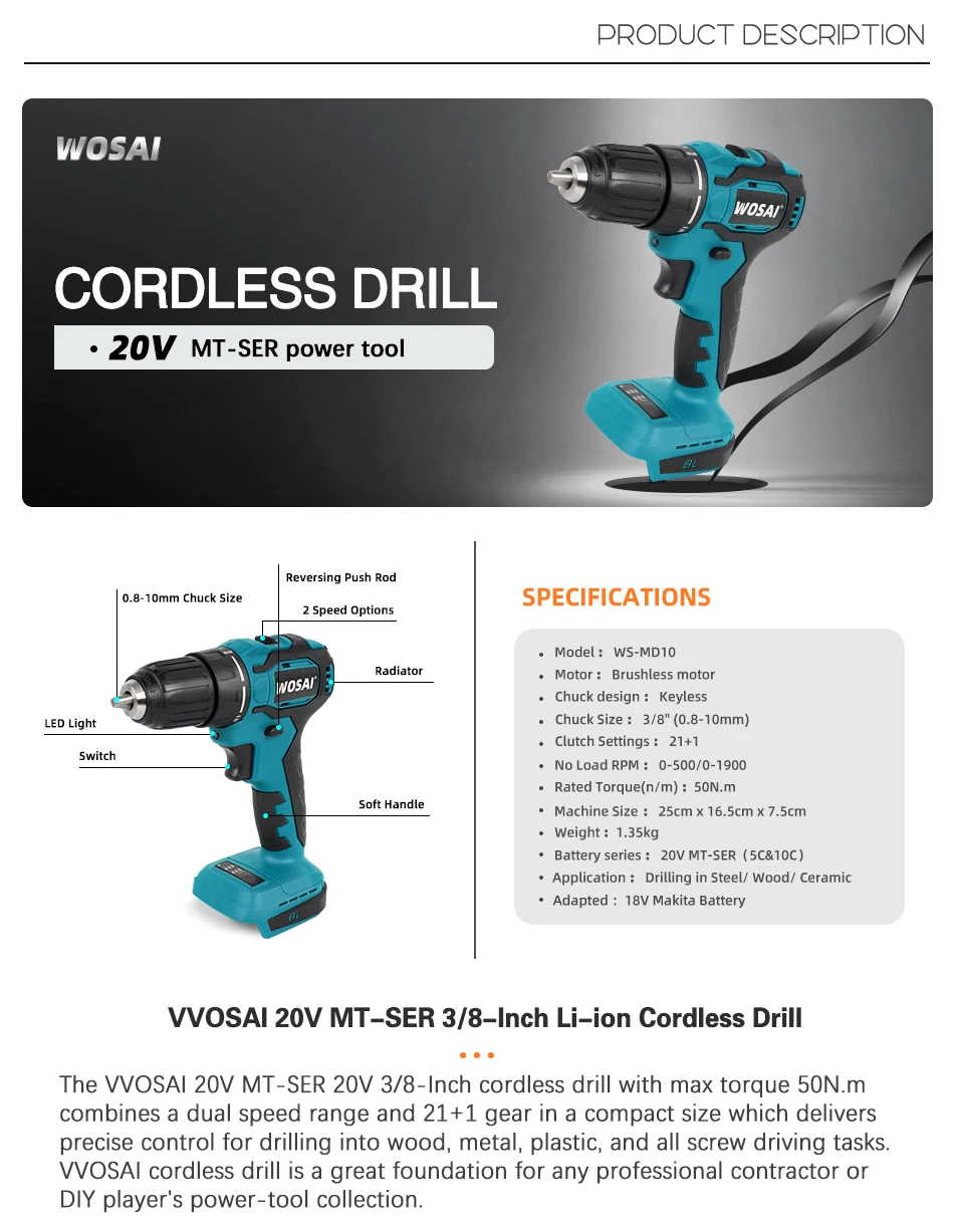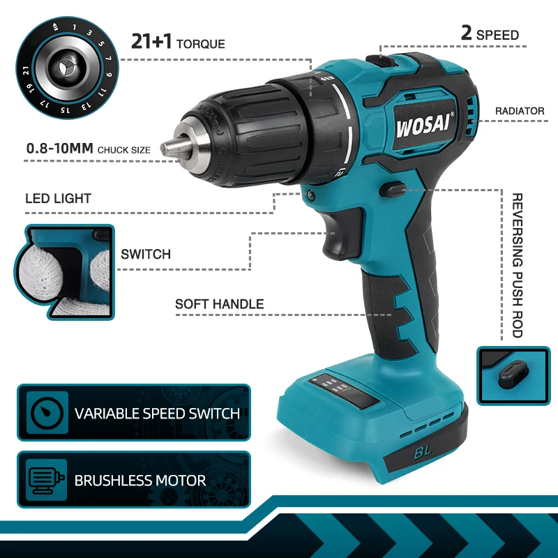 Шуруповерт WOSAI, беспроводной, 21 + 1 крутящий момент, для литиевых батарей Makita 18 в