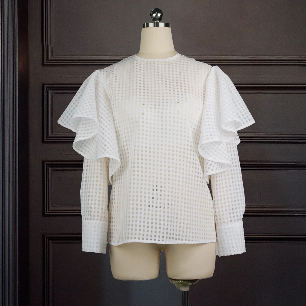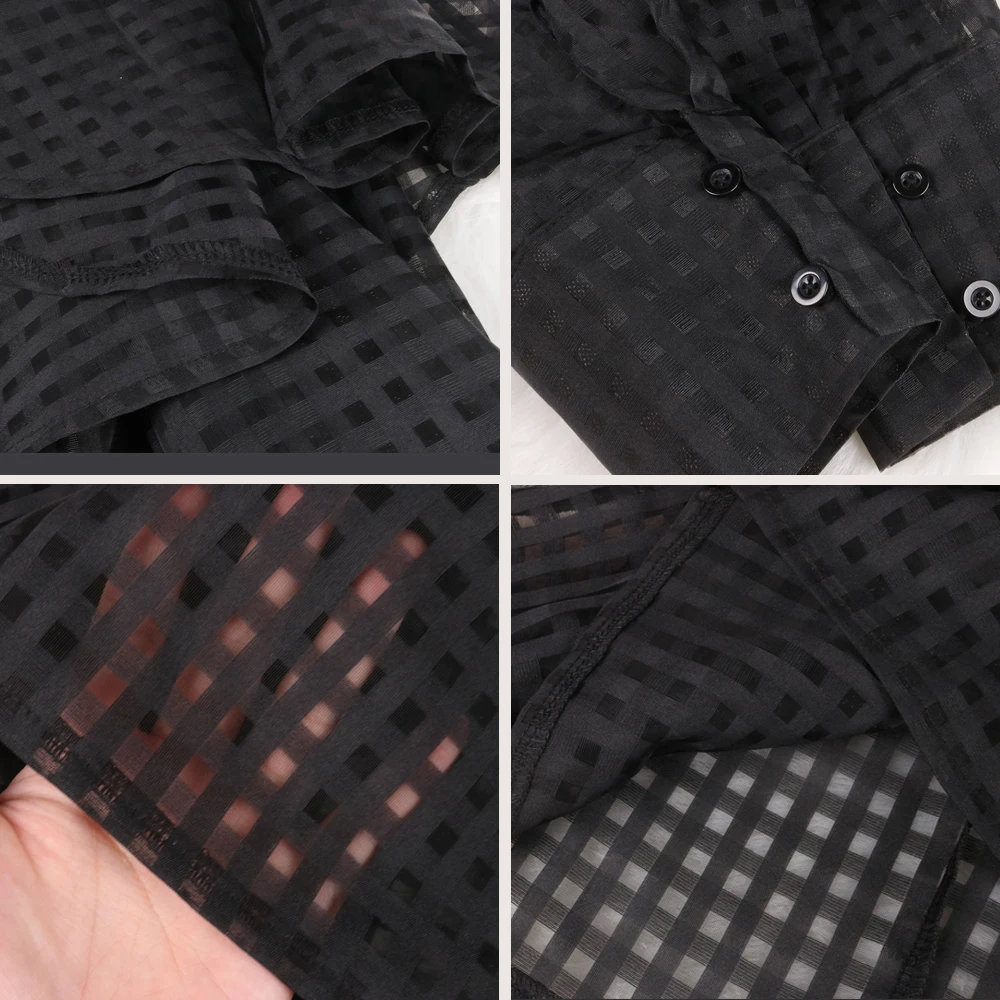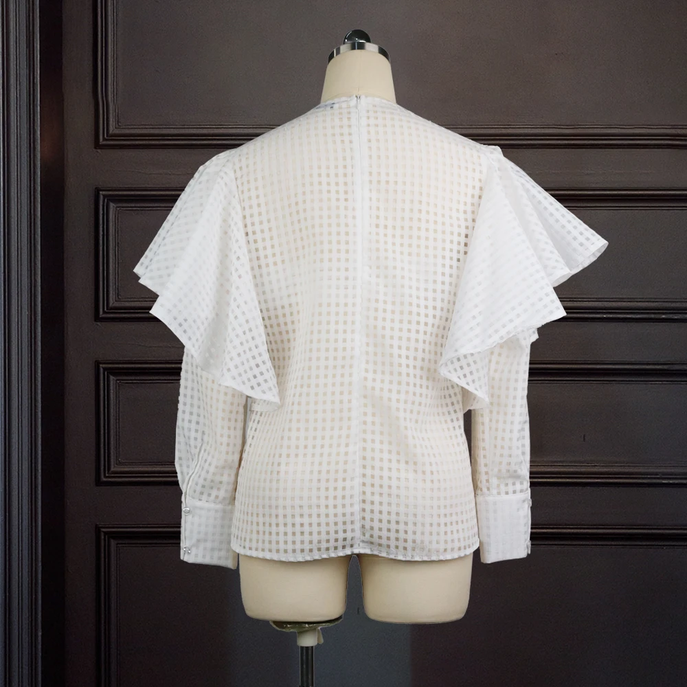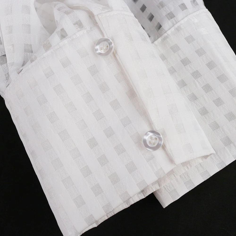 Женская прозрачная блузка, белая рубашка с длинным рукавом, прозрачная, с оборками, с принтом в клетку, для вечевечерние, свиданий, клубов