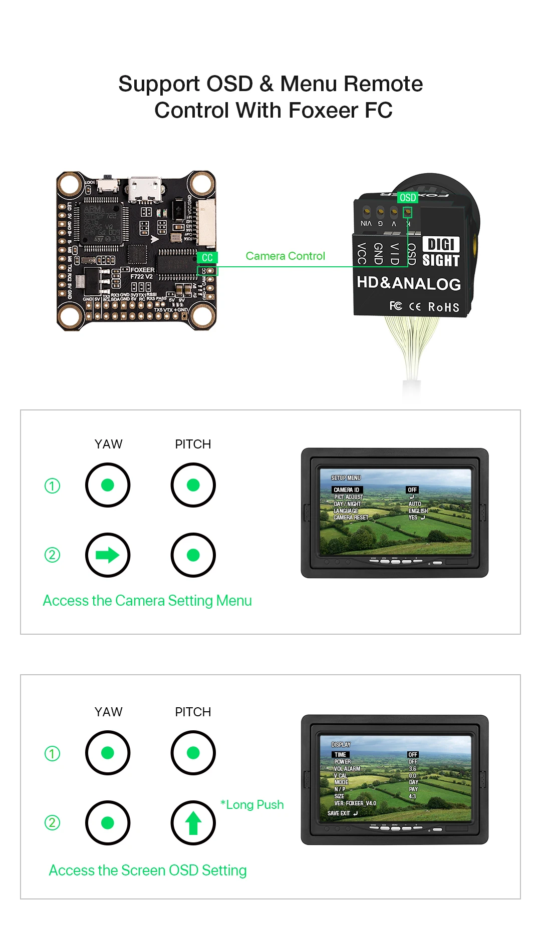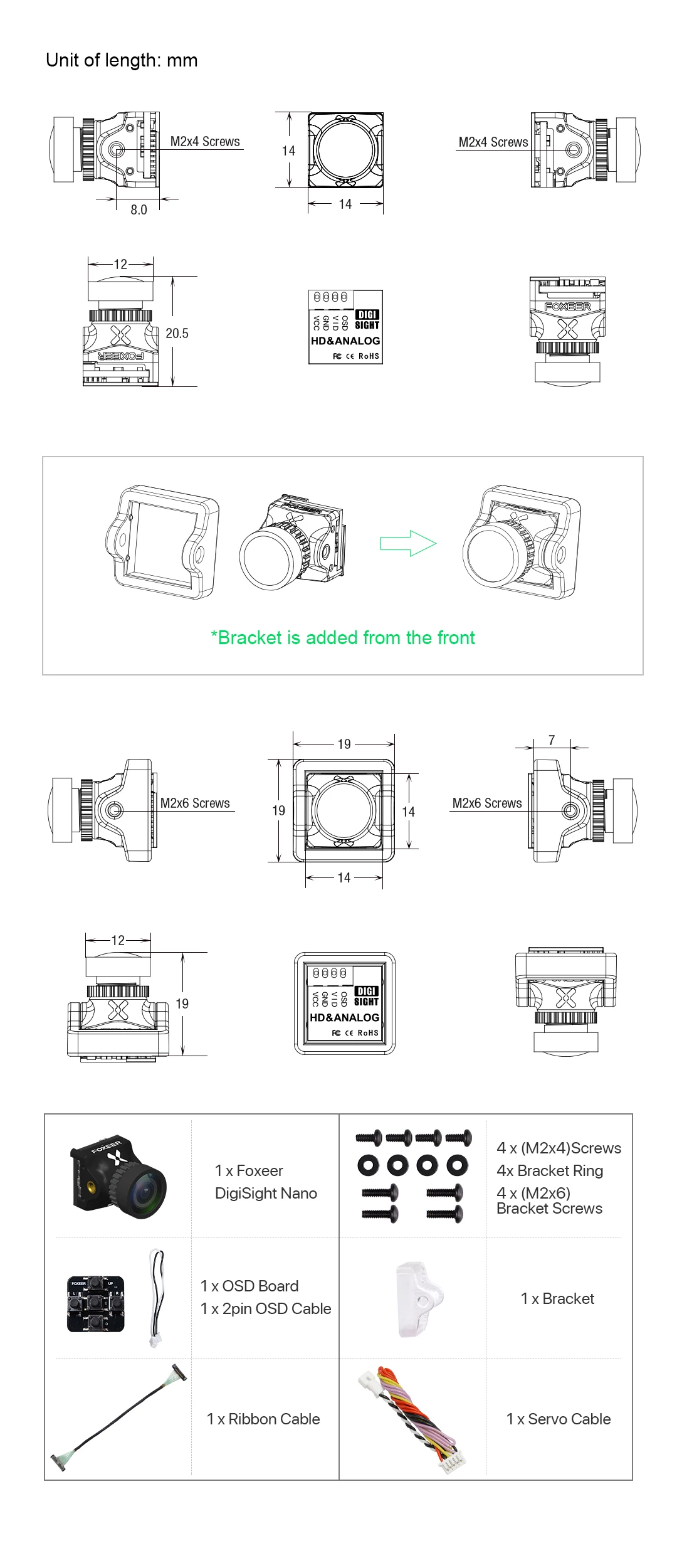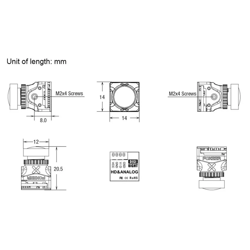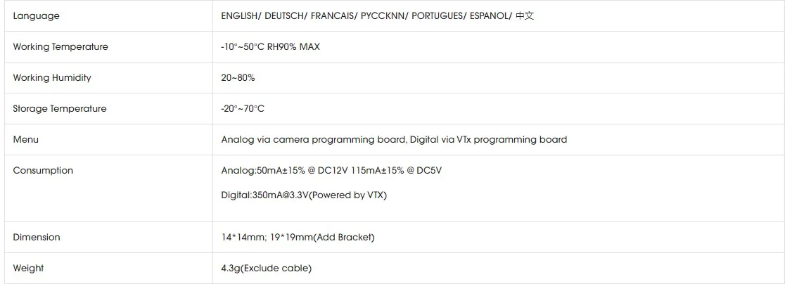 Параметры продукта:Название продукта: DigiSight Nano (цифровой HD и аналоговый)Тип датчика: CMOS 1/3Соотношение сторон экрана: 4:3/16:9 ПереключаемыйТелевизионная система: переключаемый PAL/NTSCРазрешение: аналоговый: 1000TVL цифровой: 720PВидеовыход: CVBSПоле зрения: объектив 1,7 ммМоделирование: FOV-D 155 ° FOV-H125 °Цифровой: FOV-D 145 ° FOV-H120 °Низкое освещение: 0,01 люксБаланс белого: автоматическийСкорость затвора: АвтоматическаяАвтоматическое усиление: автоматическоеШумоподавление: 3D шумоподавлениеШирокий динамический: Сверхширокий динамическийРежим: день/ночь светодиодный/черный и белыйOSD: название/напряжение (только аналоговый)/времяПереключатель Быстрого режима: поддержка (долгое нажатие правой кнопки)Дистанционная настройка: с полетным контроллером FoxeerКрест волос: Off (по умолчанию)Зеркало: вверх, вниз, влево и вправоВходное напряжение: аналоговый: 4,5-20 в, цифровой: 3,3 ВЯзык: английский/немецкий/французский/Португальский/Испанский/китайскийРабочая температура: -10 ° ℃ ~ + 50 °C RH90 % макс.Рабочая влажность: 20 ~ 80%Температура хранения: -20 ° ℃ ~ + 70 ° ℃Влажность при хранении: 20 ~ 95%Ток (аналог): 50 мА ± 15% @ 12 В постоянного тока, 15% мА ± @ 5 в постоянного токаТок (цифровой): 350mA@3.3V (источник питания передачи изображения)Меню: аналоговый сигнал: Управление клавиатурой/цифровой сигнал: Управление передачей изображенияРазмер (мм): 14 × 14 мм (без кронштейна) 19 × 19 мм (с установленным кронштейном)Вес (г): плата земли (без соединительного провода): 4,3 гКомплектующие:1 * Foxeer DigiSight Nano1 * кабель1 * ленточный кабель1 * кронштейн1 * 2-контактный кабель OSD1 * плата OSD винт