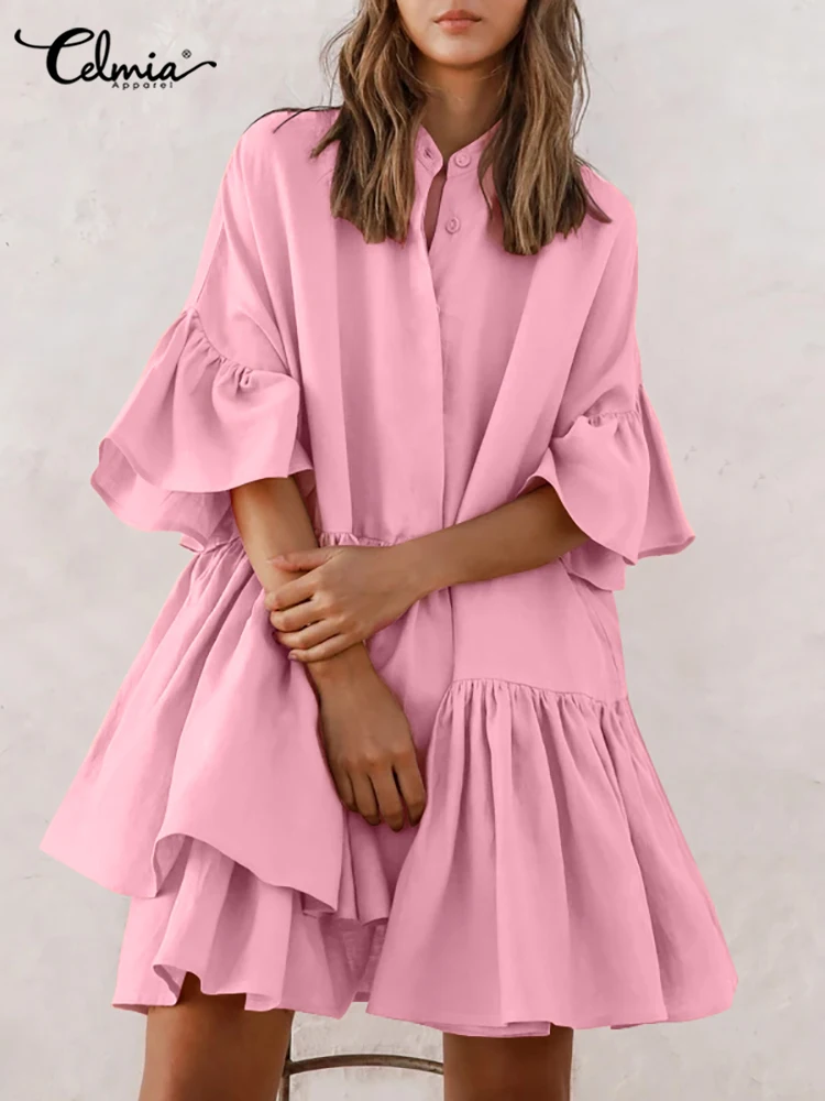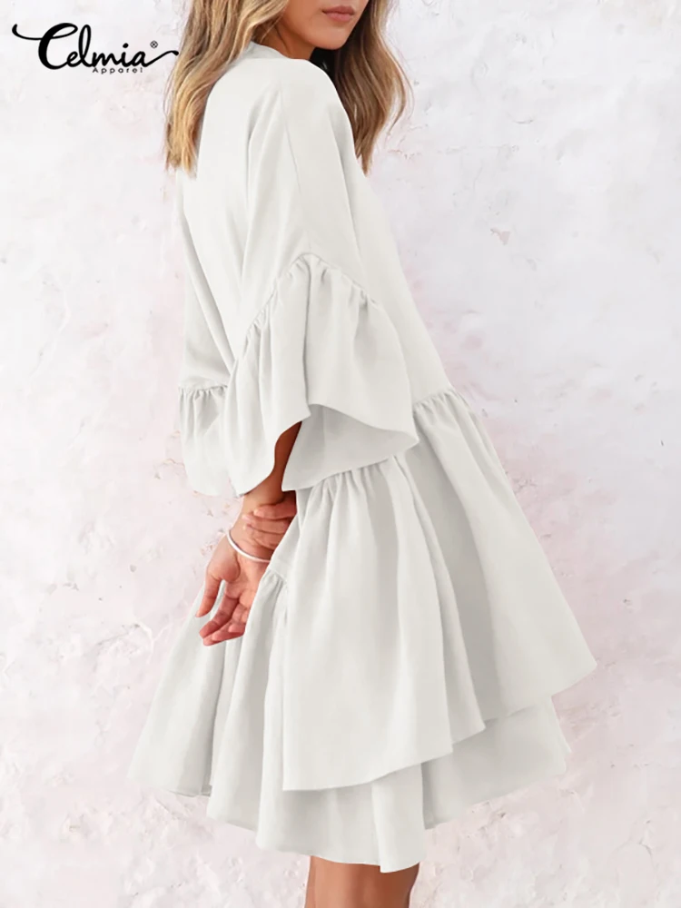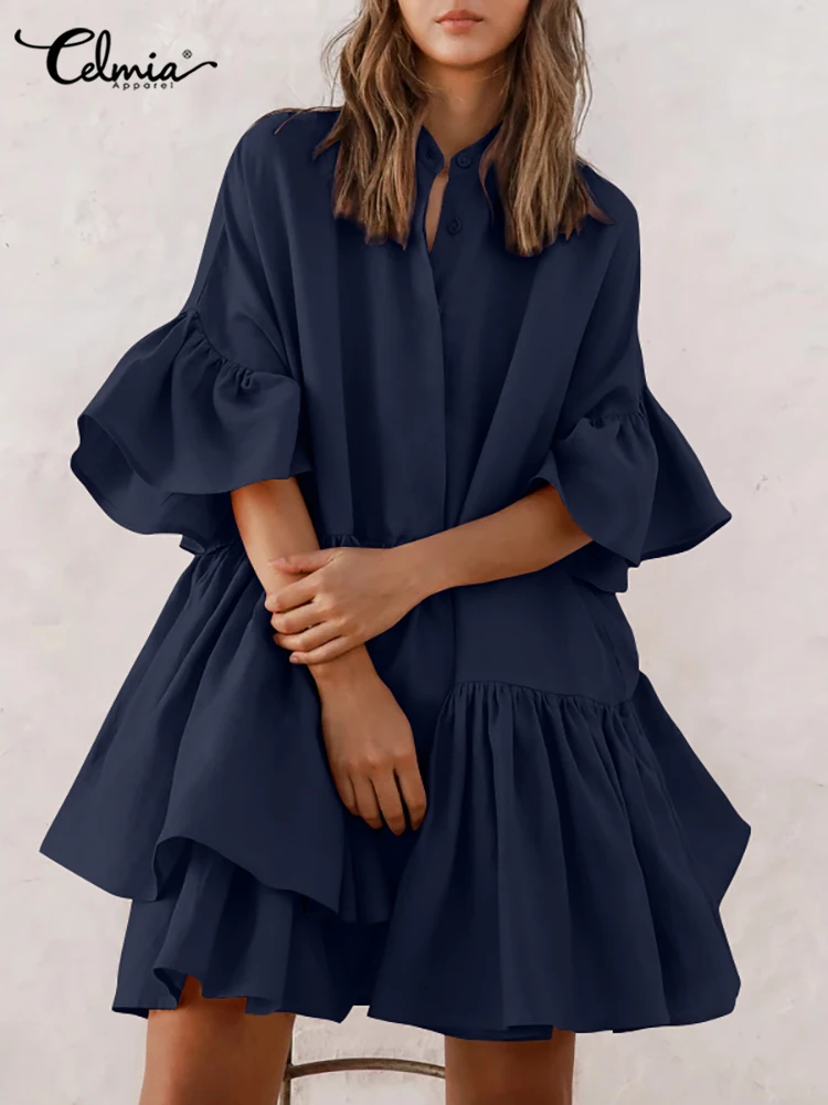 Вечернее платье Celmia, Осеннее богемное женское мини-платье 2022, сексуальное повседневное однотонное платье на пуговицах с рукавом до локтя, платье