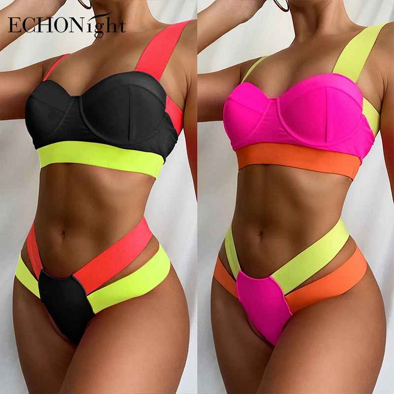 Echonight Бразильское бикини женский купальник 2021 неоновый пэчворк бикини женские Купальники пуш-ап бикини купальный костюм бикини