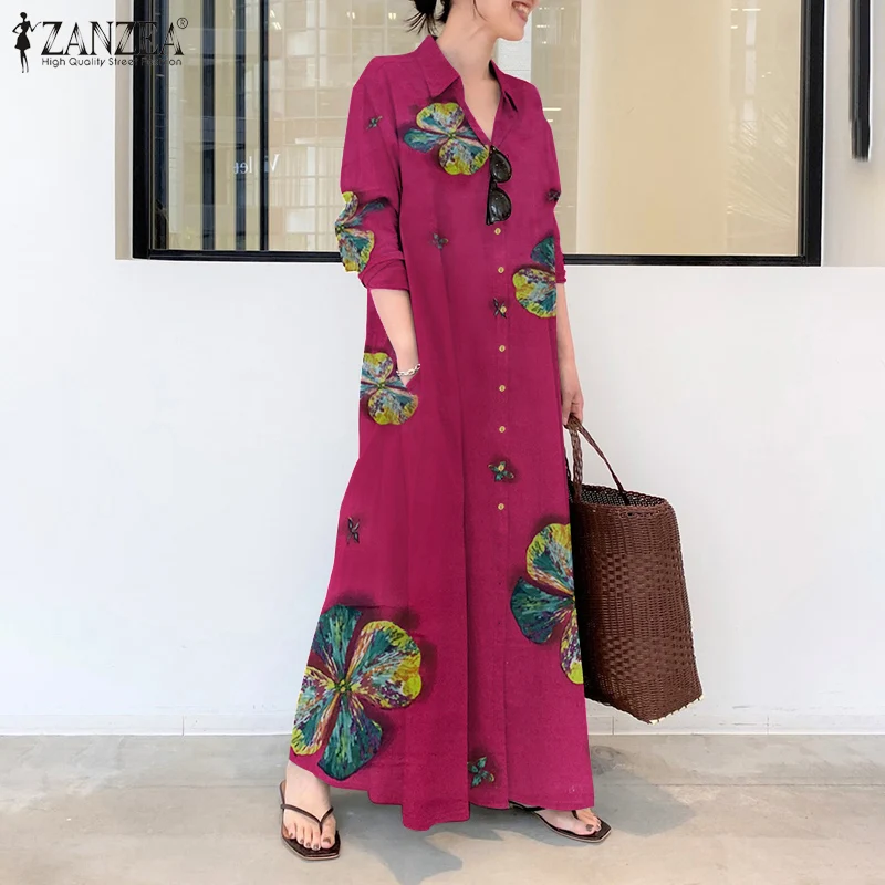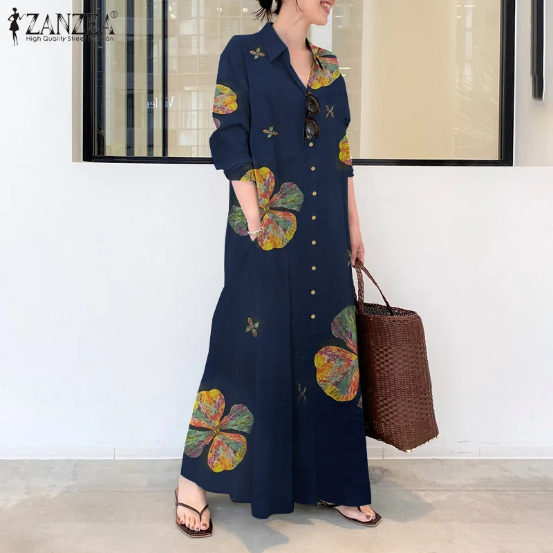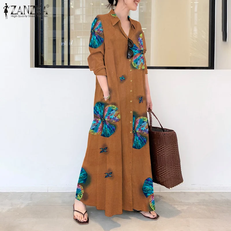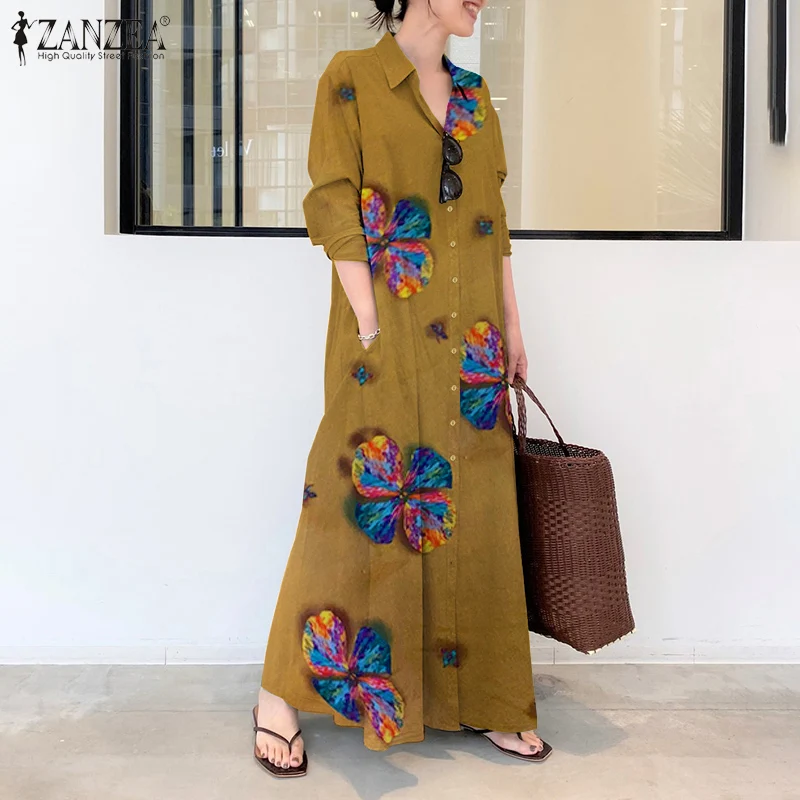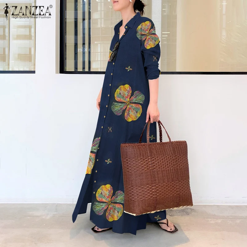 Элегантное осеннее платье-рубашка 2022 ZANZEA, женский сарафан с принтом, Повседневное Платье макси с длинным рукавом, женское платье на пуговицах