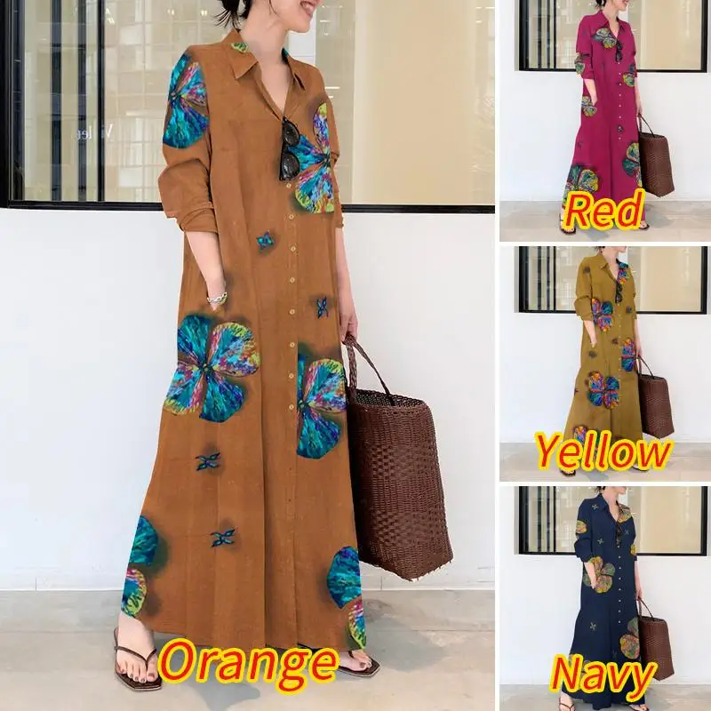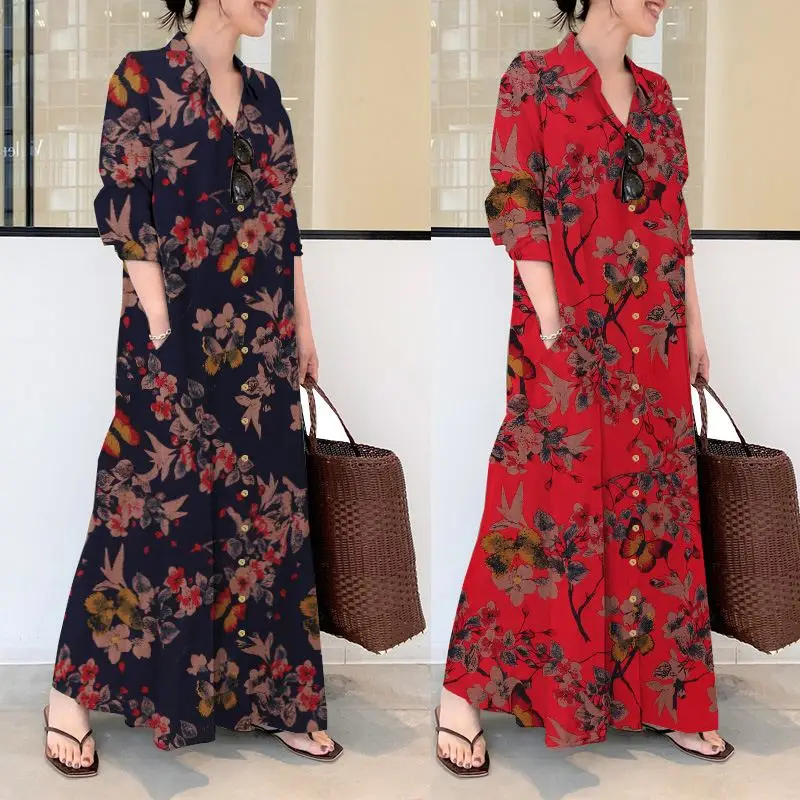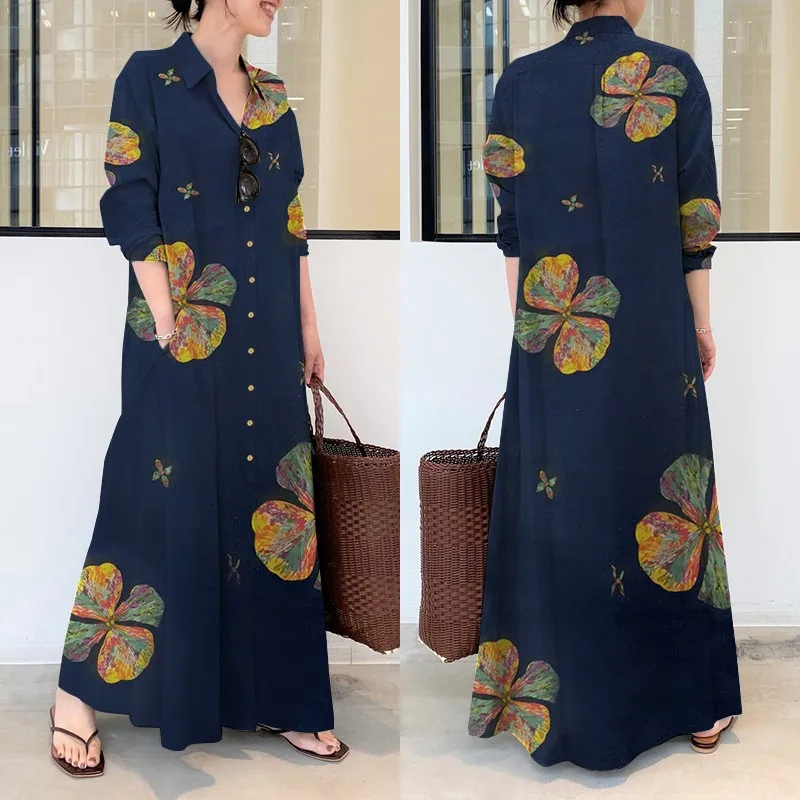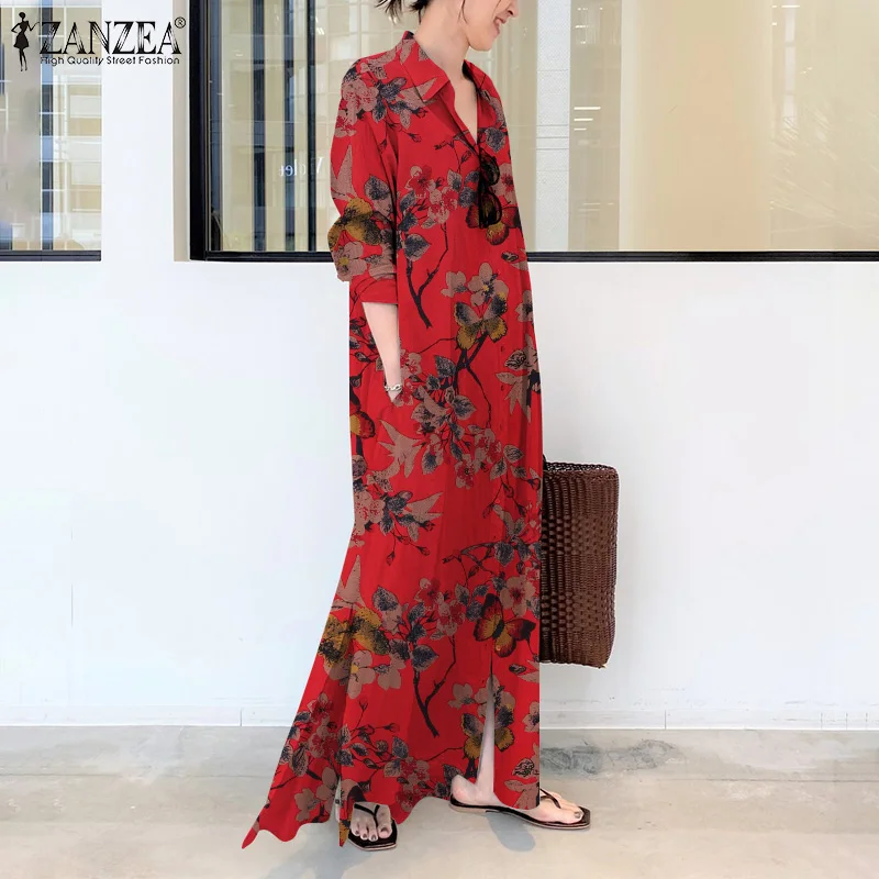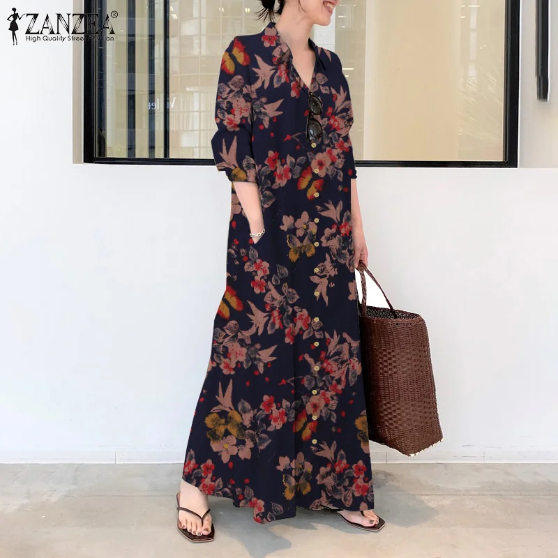Элегантное осеннее платье-рубашка 2022 ZANZEA, женский сарафан с принтом, Повседневное Платье макси с длинным рукавом, женское платье на пуговицах
