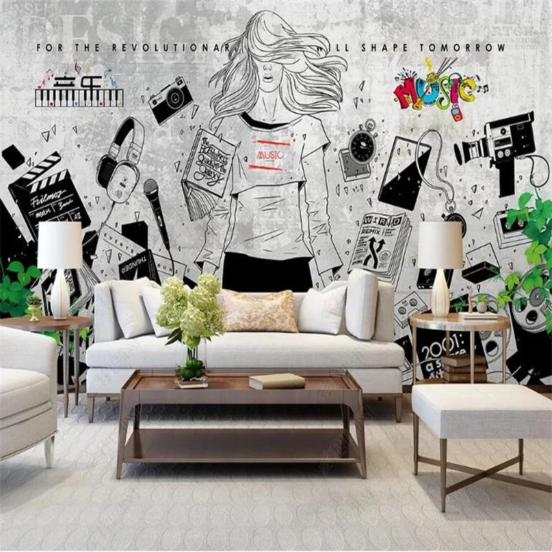 Пользовательские Ретро запись Музыка Девушка настенная бумага 3D тема Ресторан Бар Клуб промышленное украшение фон настенная бумага 3D