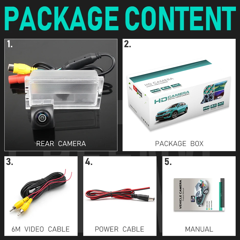 1. Задняя камера2. Коробка для посылка3. Видео кабель (6 м)4. Кабель питания5. Руководство пользователя