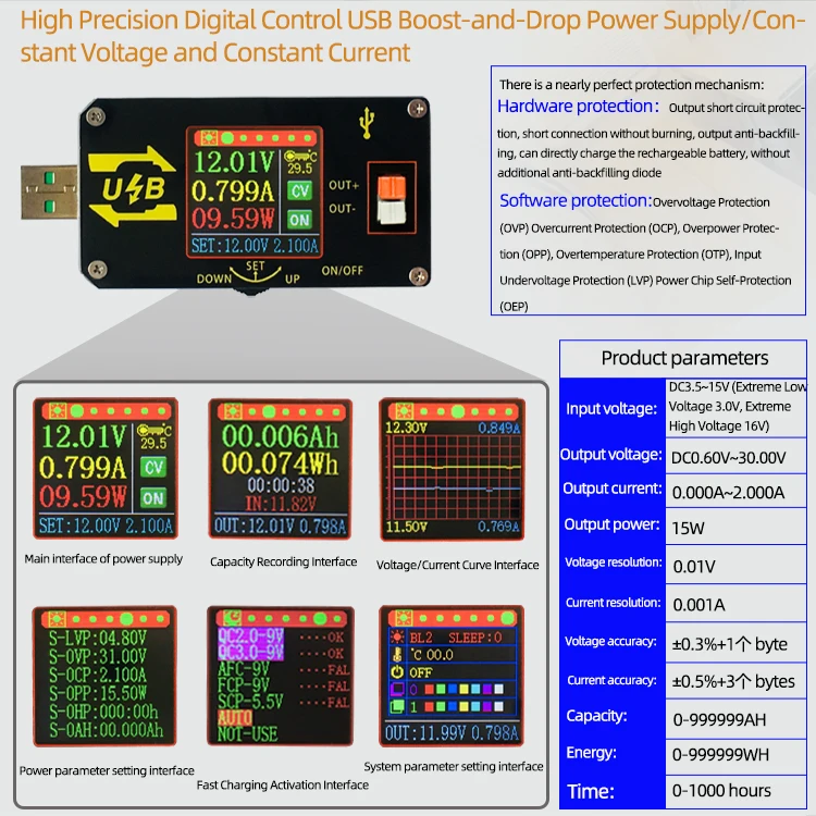 XY-UDP цифровой преобразователь постоянного тока с USB, CC CV 0,6-30 в, 5 В, 9 В, 12 В, 24 В, 2 А, 15 Вт, настольный Регулируемый источник питания