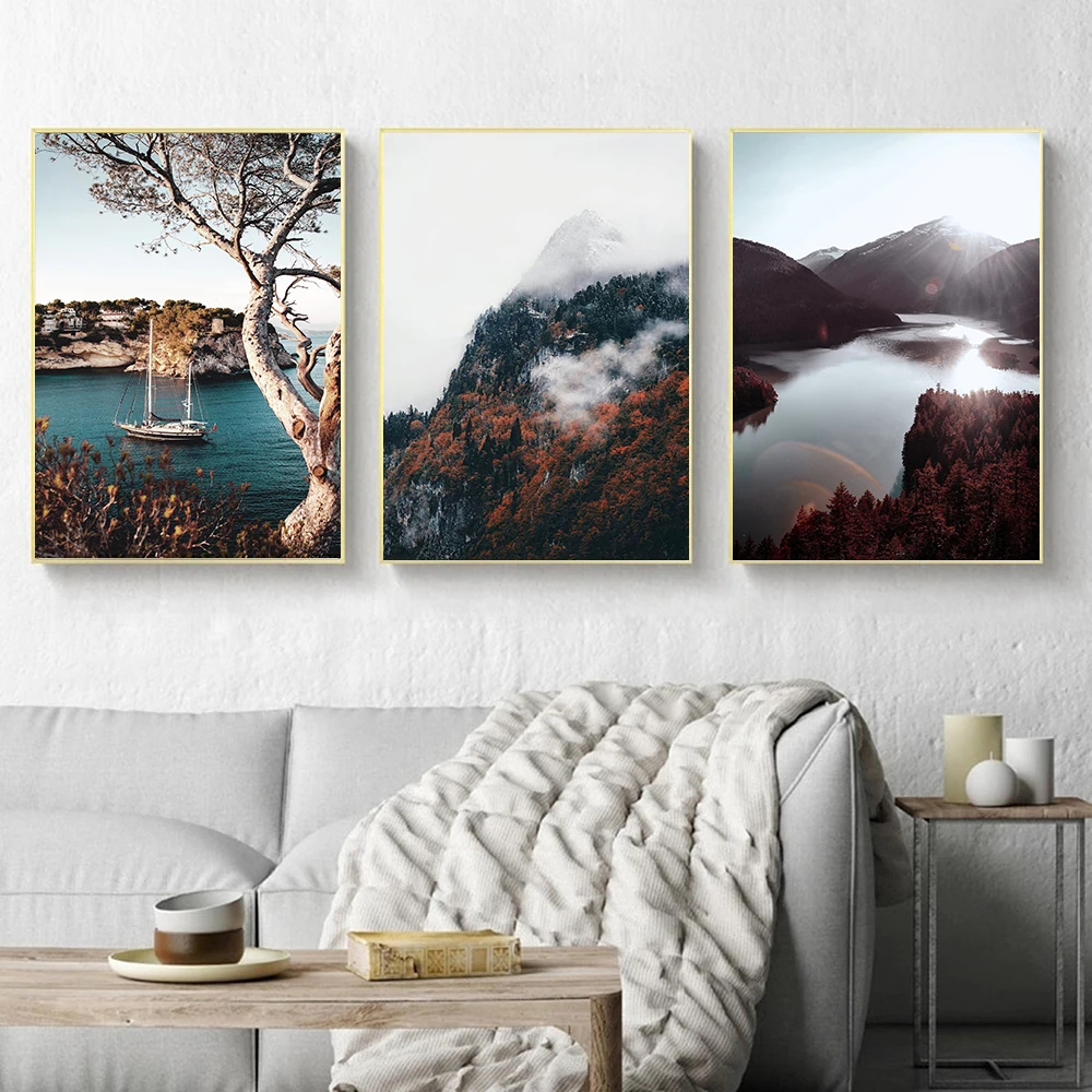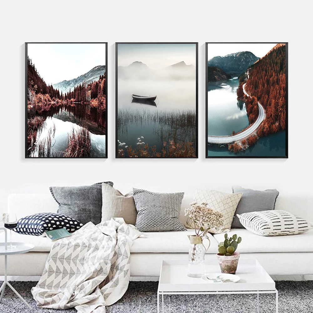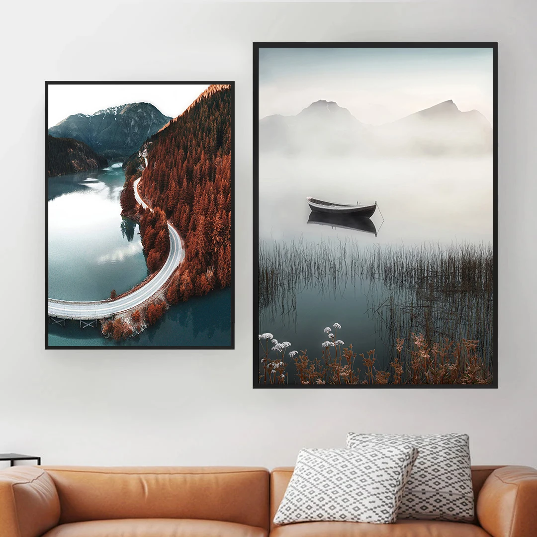Скандинавский природный пейзаж, настенный плакат, гора, озеро, лодка, принт, Скандинавская живопись, декоративная картина, Современное украшение для дома