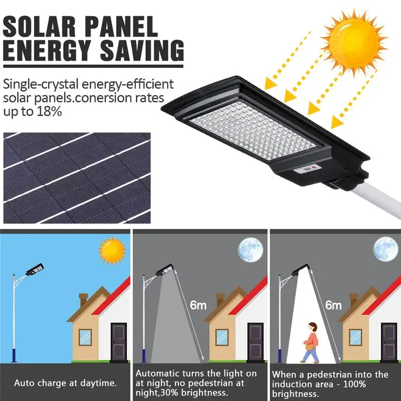 Особенности:-Зарядка от солнечной батареи, нулевая зарядка.-Простая установка, без проводов.-300/936 светодиодный, светодиодный светильник высокой яркости, зеленый и энергосберегающий.-Высококачественные батареи, длительный срок службы, большая емкость.-Корпус из алюминиевого сплава, предотвращающий нагревание под дождем.-Сверхмощный инфракрасный пульт дистанционного управления.-IP65 водонепроницаемый.-Беспроводной пульт дистанционного управления на расстоянии 8 м.-Поликристаллическая солнечная панель преобразует солнечную энергию в электричество, более экологически чистый.-Технология распознавания человеческого тела делает его более энергоэффективным, светильник включается при обнаружении движения, тусклый светильник при отсутствии движения.Характеристики:Напряжение: 6 ВЦвет: черныйСветильник Цвет: белыйВодонепроницаемость: IP65Мощность: 1800/3500 ВтСветодиодный Кол-во: 462/936 штДлительный срок службы: 50000 ч (светодиодный)Материал: акрилонитрил бутадиен-стирол (ABS) + Поликарбонат (PC)Режим: кнопочное управление + светильник + таймер + пульт дистанционного управления + датчик R-adarМощность:1800 Вт:Цвет: черныйЛюмен: 180000лмСолнечная панель: 6 В/15 ВтВремя зарядки: 6-8 чВремя работы: 12 чСтепень водонепроницаемости: IP65Материал корпуса: АБС-пластик + ПоликарбонатУгол срабатывания: 120 градусовЭффективный диапазон: 5 - 8 метровСветильник источник: 300LED 5730SMDЦветовая температура: 7800K (холодный белый)Питание: 3,5 V/15000 мА/ч, литий-железо-фосфатный аккумуляторУровень водонепроницаемости: 95% герметичный эффективный водонепроницаемый (дождь)Система управления: кнопочное управление + светильник + таймер + пульт дистанционного управления + радар-датчик3500 Вт:Цвет: черныйЛюмен: 350000лмСолнечная панель: 6 В/18 ВтВремя зарядки: 6-8 чВремя работы: 12 чСтепень водонепроницаемости: IP65Материал корпуса: АБС-пластик + ПоликарбонатУгол срабатывания: 120 градусовЭффективный диапазон: 8-10 метровСветильник источник: 936LED 2835SMDЦветовая температура: 7800K (холодный белый)Питание: 3,5 V/15000 мА/ч, литий-железо-фосфатный аккумуляторУровень водонепроницаемости: 95% герметичный эффективный водонепроницаемый (дождь)Система управления: кнопочное управление + светильник + таймер + пульт дистанционного управления + радар-датчикПрименение:-Наружная стена или столб на площади, парке, саду, во дворе, улице, дорожке, тропе, кампусе, ферме, по периметру безопасности и т. д.Посылка включает в себя:1 х Солнечный уличный светильник1 пульт дистанционного управления