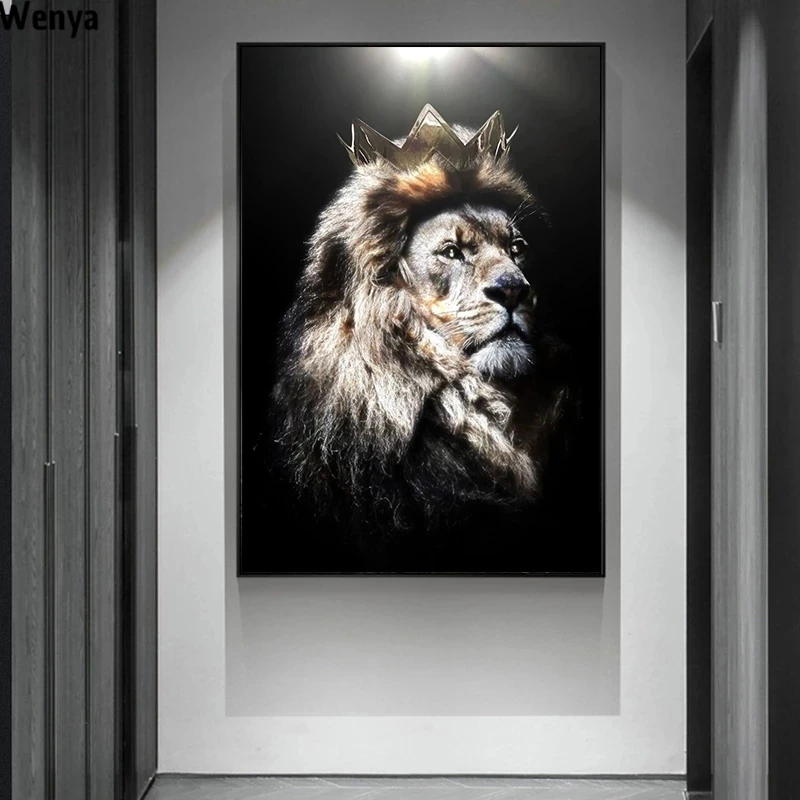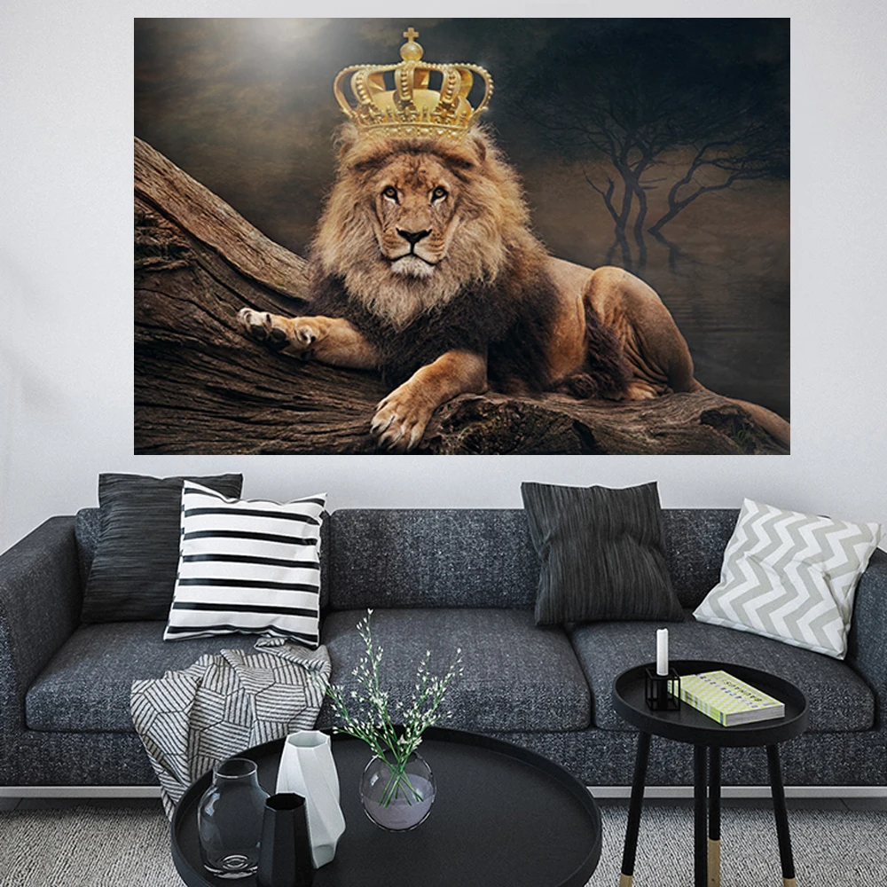 Современные животные искусство голова льва с короной картины на холсте плакаты и принты настенные картины для декора гостиной (без рамки)
