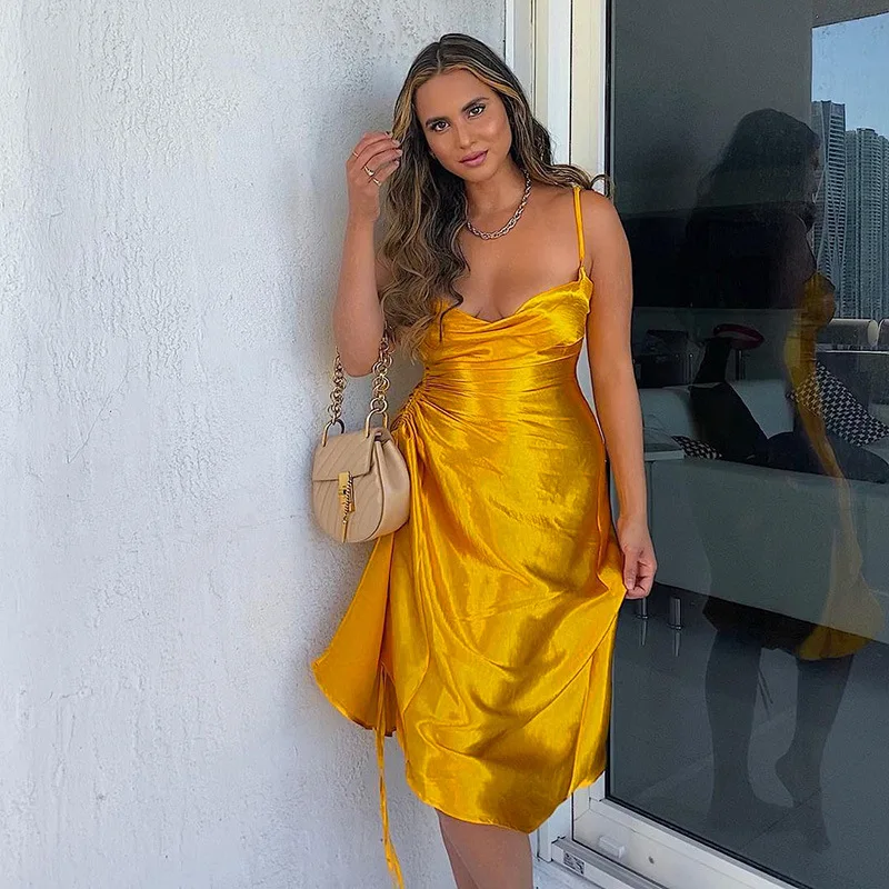 Сезонов из сатина; Женские однотонные средней длины на тонких бретелях платье завязками сбоку со сборками с разрезом и открытыми плечами облегающее сексуальное Вечерние Элегантные 2020 осень-зима ASDR82307