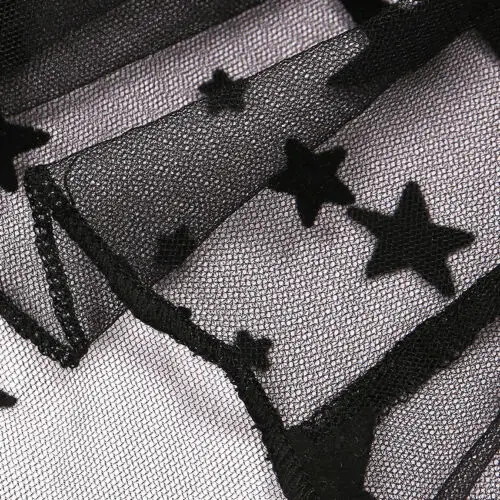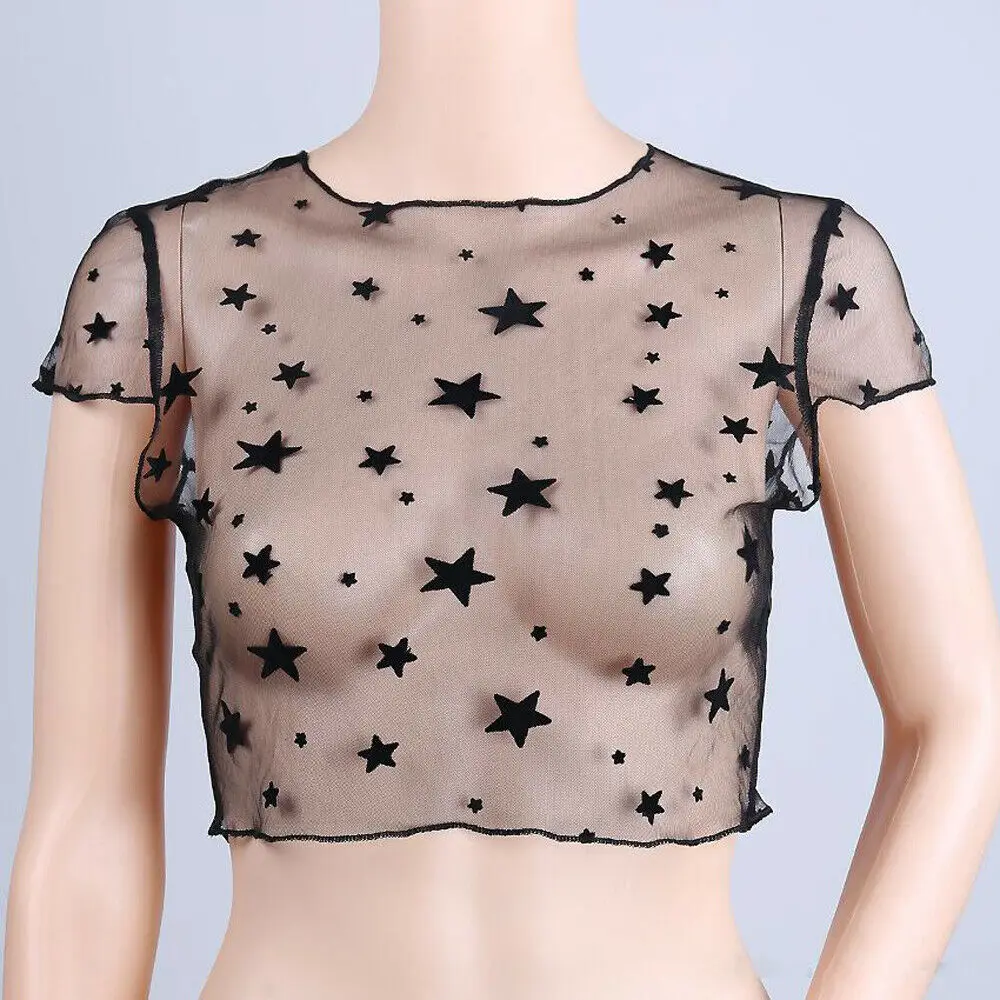 Летняя Новинка, Модный женский сексуальный сетчатый кроп-топ, сетчатая прозрачная рубашка с коротким вырезом и звездами, черно-белые топы, футболки, рубашки
