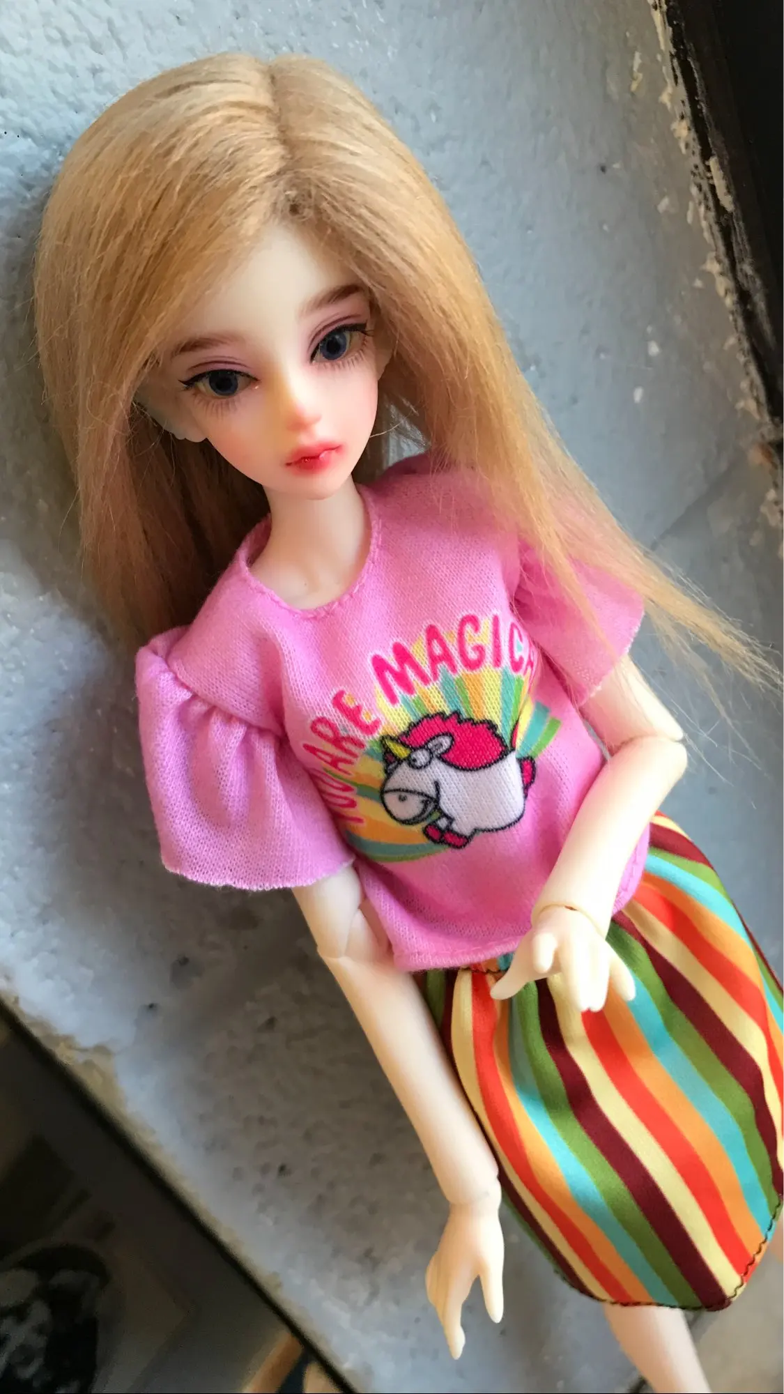 Куколка очень милая, такая стройненькая. Качество хорошее, недочётов оливки и шлифовки нет. Но здорово перетянута, какую то позу придать практически не возможно - брыкается (надо будет с этим что-то делать). Я просила сначала голубые глазки, а потом мне захотелось сиреневые и продавец сделал всё как я хотела. За что ему большое спасибо. Я довольна покупкой.