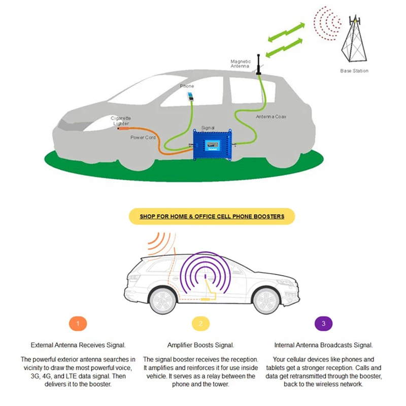 1. Наружная антенна получает хороший сигнал от сигнальной башни. 2. Затем через кабель отправил сигнал на внутренний ретранслятор. 3. Повторитель принимает и улучшает сигнал. 4. После этого, тонкий сигнал переходит в внутреннюю антенну, через кабель к вашему мобильному телефону.