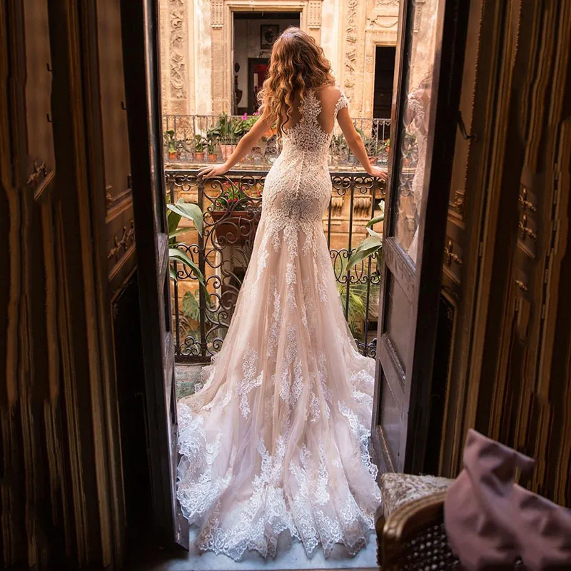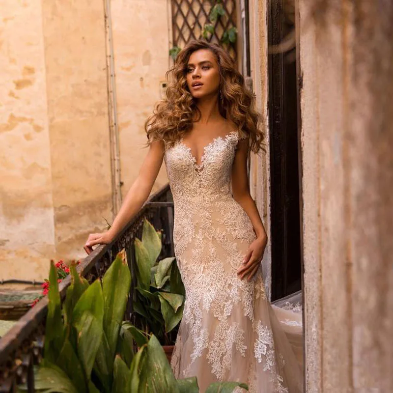 Сексуальное свадебное платье цвета шампанского и русалки для невесты 2021 с v-образным вырезом и рукавами-крылышками с аппликацией, кружевное свадебное платье для женщин Boho Vestidos De Novia