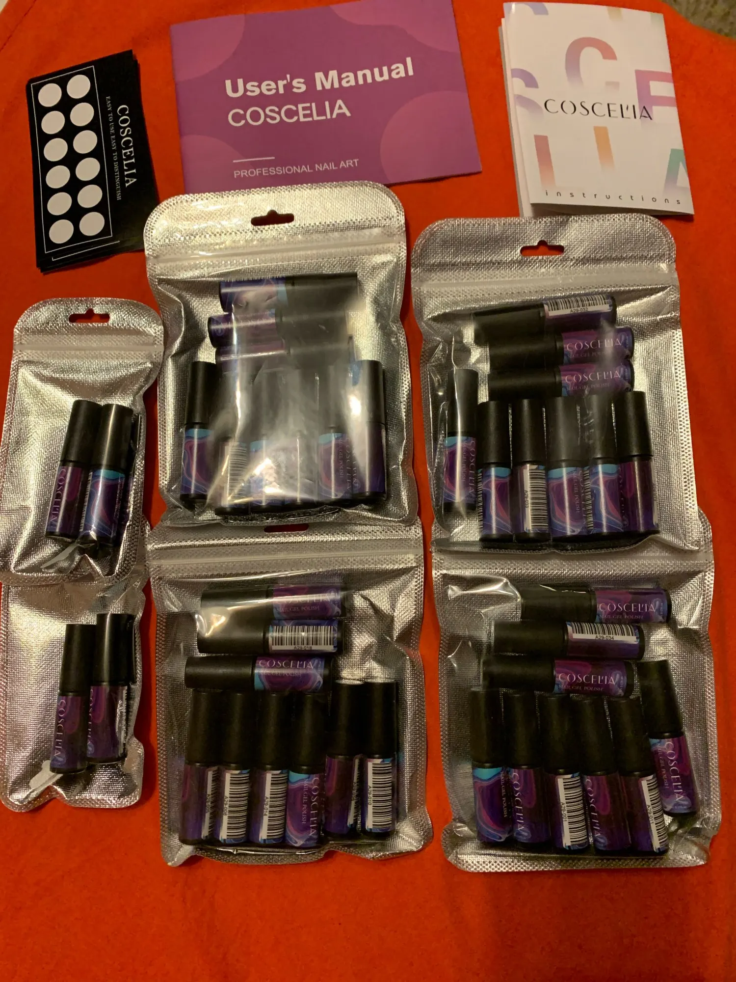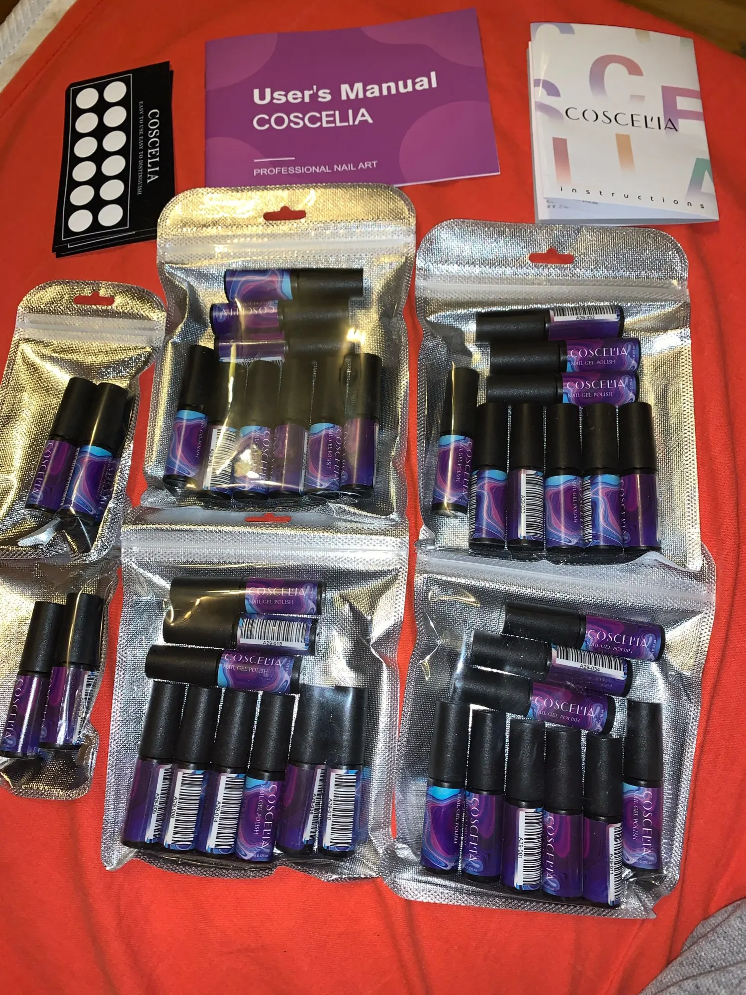 Пришёл товар быстро, трек отслеживался в приложении IML, привёз курьер в назначенное время и место. Цвета и количество соответствует, 40 штук по 8 мл. Ничего не пролилось, упаковано в коробку и бумажную упоковочную бумагу. Качество хорошее держится нормально, не откалывается, не сходит. Покрывать нужно 2-3 слоя. Спасибо за качественный товар и быструю доставку.