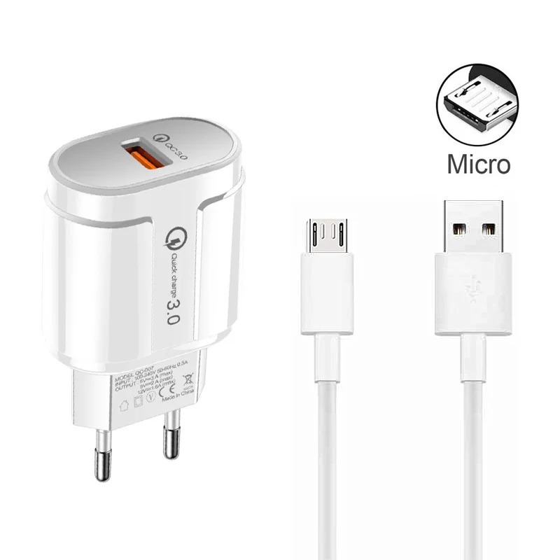 Зарядное устройство QC 3,0 с вилкой европейского стандарта, 18 Вт, кабель Micro USB Мобильный телефон для Samsung S7 S6 edge J310 J330 J710 J510 A5 A6 A7 2018, USB-кабель