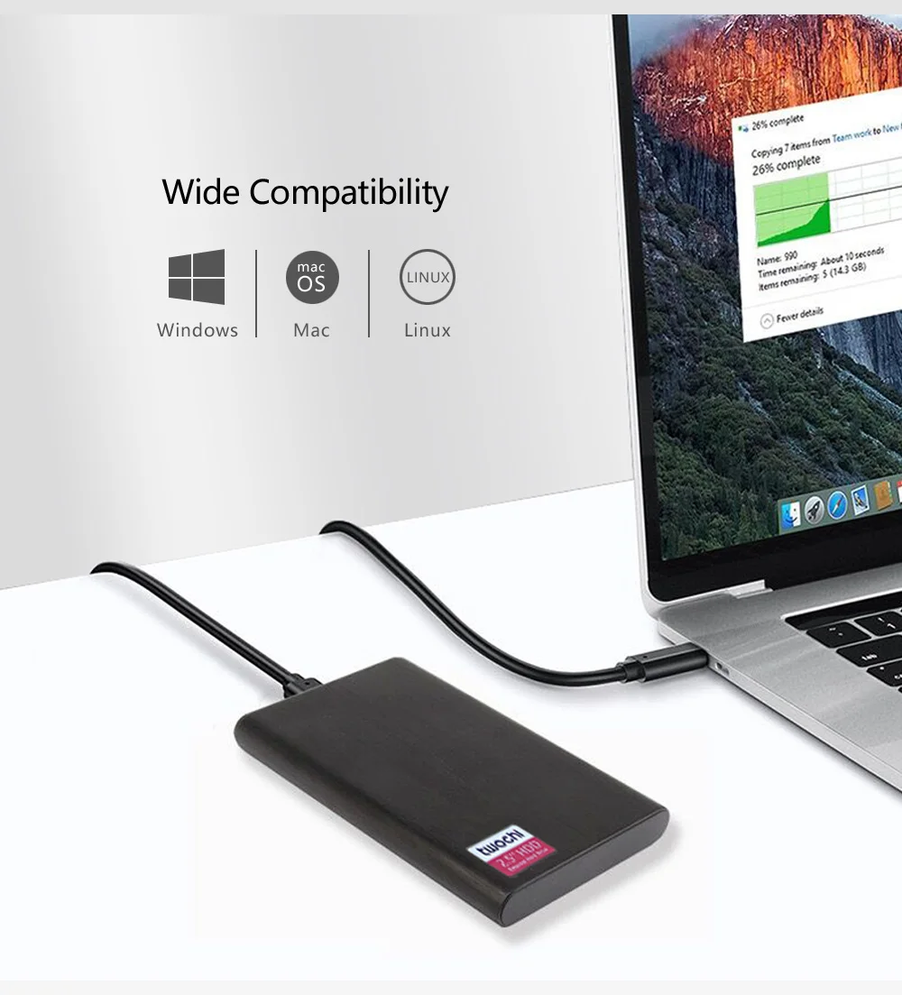 Характеристики:Бренд: TWOCHIМодель: TCM19Емкость: 80 ГБ, 120 ГБ, 160 Гб, 250 ГБ, 320 ГБ, 500 Гб, 750 Гб, 1 ТБ (необязательно)Материал корпуса: металлЦвет: синий, красный, черный, серебристый (по желанию)Подключение: USB 3,0Размер жесткого диска: 2,5 дюймаМаксимальная скорость передачи: 25 м/с ~ 142 м/сРазмер элемента: 122*780*13 мм (Д * Ш * В)Операционная система: Windows 10 / 8 / 7 / Vista / XP, Mac OS X, Linux OS.Комплектация:1 * портативный жесткий диск1 * USB-кабель1 * Руководство пользователяВнимание:Более низкая емкость может быть продемонстрирована вашим компьютером из-за использования другого стандарта измерений.(1 ТБ = 1000 ГБ, 1 ГБ = 1000 Мб, 1 Мб = 1000 КБ)80 Гб до 74 ГБ, 120 ГБ до 111 ГБ, 160 Гб до 149 ГБ, 250 ГБ до 232 ГБ, 320 Гб до 298 ГБ500 Гб До 465 ГБ, 750 Гб до 698 ГБ, 1 ТБ до 930 ГБ, 2 ТБ до 1860 ГБ.