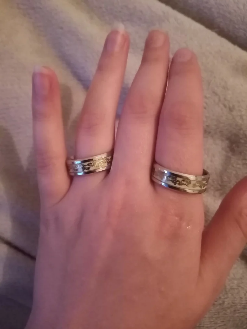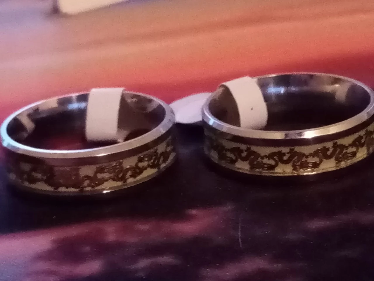 Я не поняла, чем отличаются кольца, но выглядят классно. Драконы детализированы, кольца удобны в носке, выглядят красиво. Светятся в темноте, если их "зарядить" (я фонариком светила). Продавец отправил повторно, когда алиэкспресс отменил доставку. (увы, ошиблась с размером. просила продавца отправить меньше, но не вышло. кольца всё равно отличные, закажу ещё какие-нибудь)