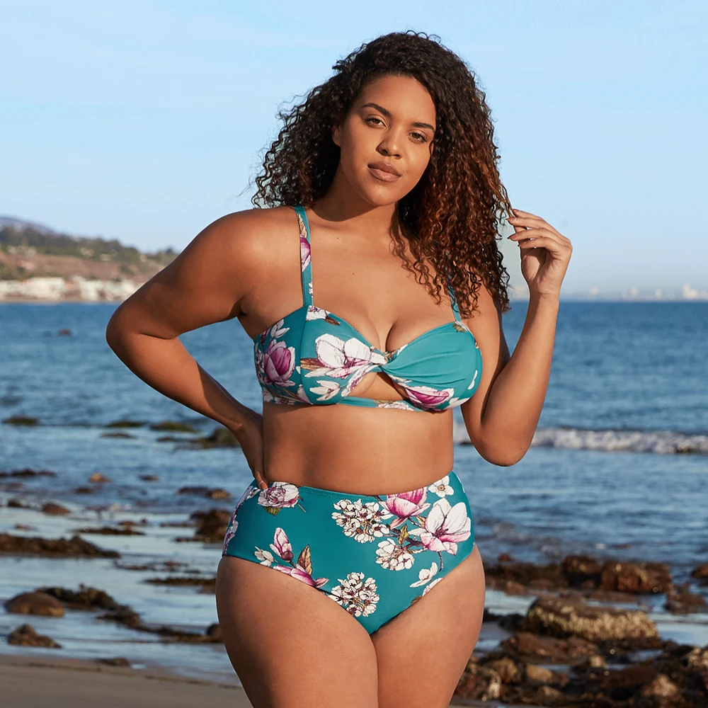 Наш синий цветочный вырез с высокой талией размера плюс бикини станет вашим любимым набором! Имеет вырез peekaboo спереди по центру и низ с высокой талией для уменьшения покрытия животика.