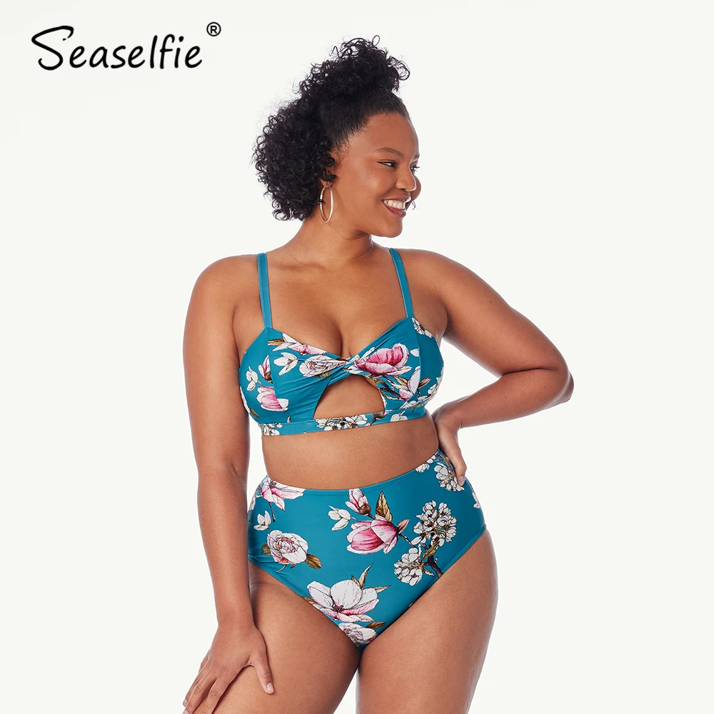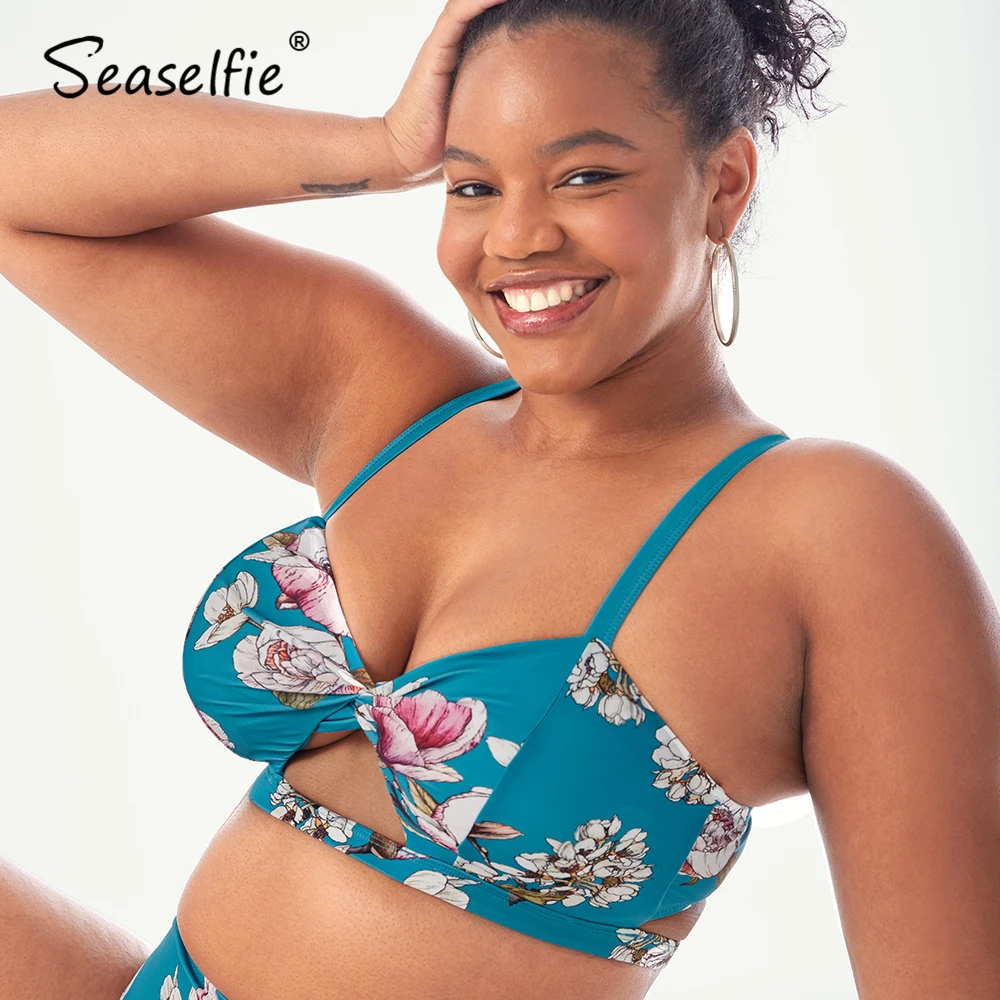 SEASELFIE размера плюс синий цветочный комплект бикини с высокой талией, женский сексуальный раздельный купальник большого размера с вырезами, новинка 2022 года, купальный костюм