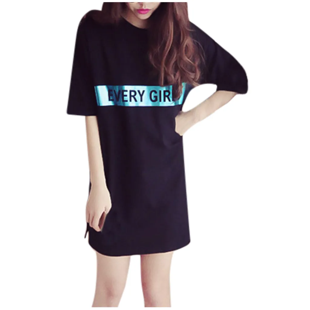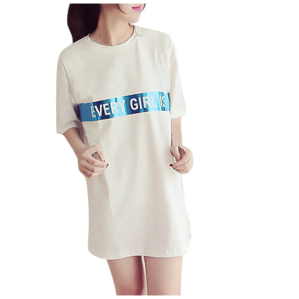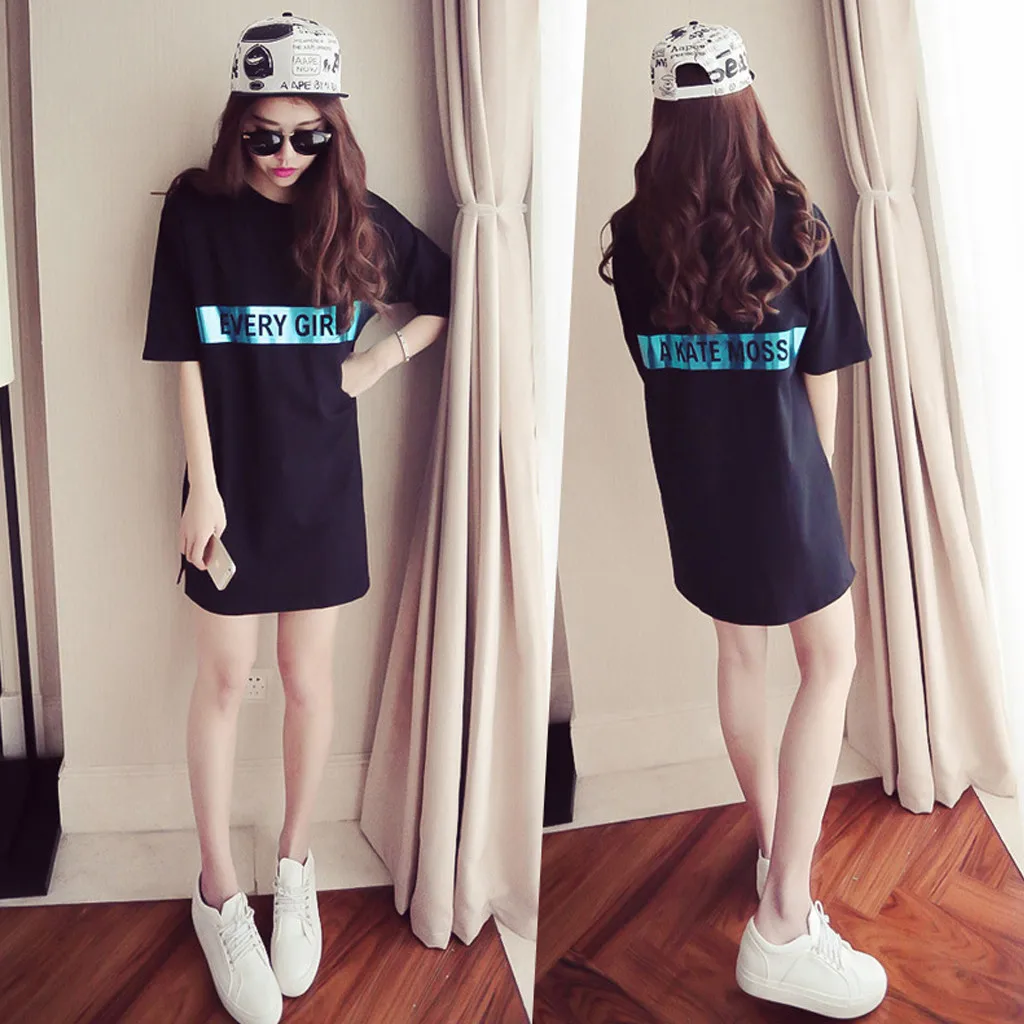 Топы свободного кроя буквенный принт женский т рубашки для мальчиков лето модное платье с О-образным вырезом с коротким рукавом Дамы Мини платье-футболка; Прямая поставка; Kawaii