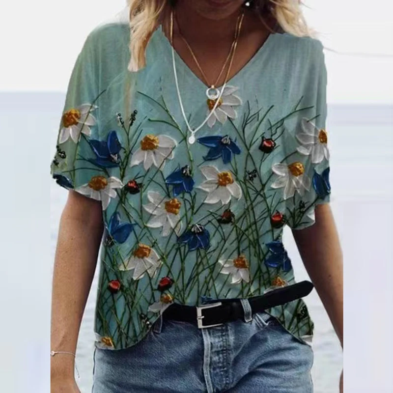 Женская Винтажная футболка, с V-образным вырезом и принтом, с корот...