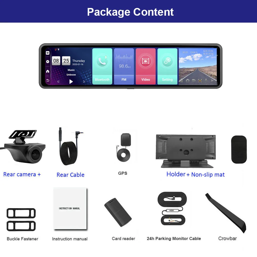 ① 12-дюймовый полноэкранный широкоформатный экран для предварительного просмотраВысокопрозрачный 12-дюймовый широкоформатный ЖК-дисплей 16:9 обеспечивает более широкий обзор, позволяющий контролировать всю дорогу во время вождения. Полностью сенсорный дисплей для потокового видеоЗеркало для потокового видео улучшает примерно в четыре раза больше поля обзора, чем традиционное зеркало заднего вида. ① 1:1:1 дисплей с разделенным видомПолное зеркальное отображение переднего видео или изображения; Полное отображение заднего видео или изображения; 3 разделенного просмотра музыки, GPS карты и видео; Отображение изображения и изображения. →Видео Full HD 1080PФронтальная камера снимает видео full-hd 1080p. Широкий динамический диапазон позволяет камере оптимально работать в любой ситуации освещения, регулируя экспозицию для создания сбалансированных изображений и отснятого материала. Дисплей в режиме реального времени с обратным видом на парковкуУмный переключатель угла заднего вида между вождением и парковкой. Во время вождения в режиме реального времени вы можете четко видеть все дальнейшие транспортные средства и объекты. ① Широкоугольный угол 170 градусовБлагодаря широкоугольному объективу 170 градусов камера комфортно контролирует 3 полосы движения. С этой видеорегистратором нет слепых зон. ① Просто Отрегулируйте угол обзора на экране пальцемСдвиньте вверх и вниз, чтобы настроить поле обзора; Нажмите на экран, чтобы переключиться между передней и задней камерами; Проведите пальцем →24-часовой мониторинг парковки видеорегистраторЕсли видеорегистратор будет шокирован любыми внешними силами, такими как вор при парковке, он автоматически включится для записи. Мы подготовили к вам 24-часовой кабель монитора парковки. Когда автомобильный аккумулятор разряжен, понижающая линия защитит аккумулятор от повреждений. ① Циклическая запись и датчик удараАвтоматическая запись видео и блокировка видео с питанием от G-сенсора при обнаружении столкновения или аварии. Чувствительность G-сенсора может быть установлена на разные уровни.Функция циклической записи-обеспечивает непрерывную запись без потери секунды, автоматическую запись во время зажигания автомобиля, автоматическое выключение при выключении зажигания для освобождения от рук.
