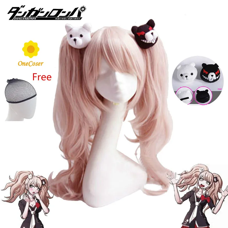 Danganronpa джунко эношима косплей парик розовый Кудрявый Длинный хвост Медвежонок Клип Синтетические волосы + Бесплатный парик шапка вечерние ролевые игры для девочек