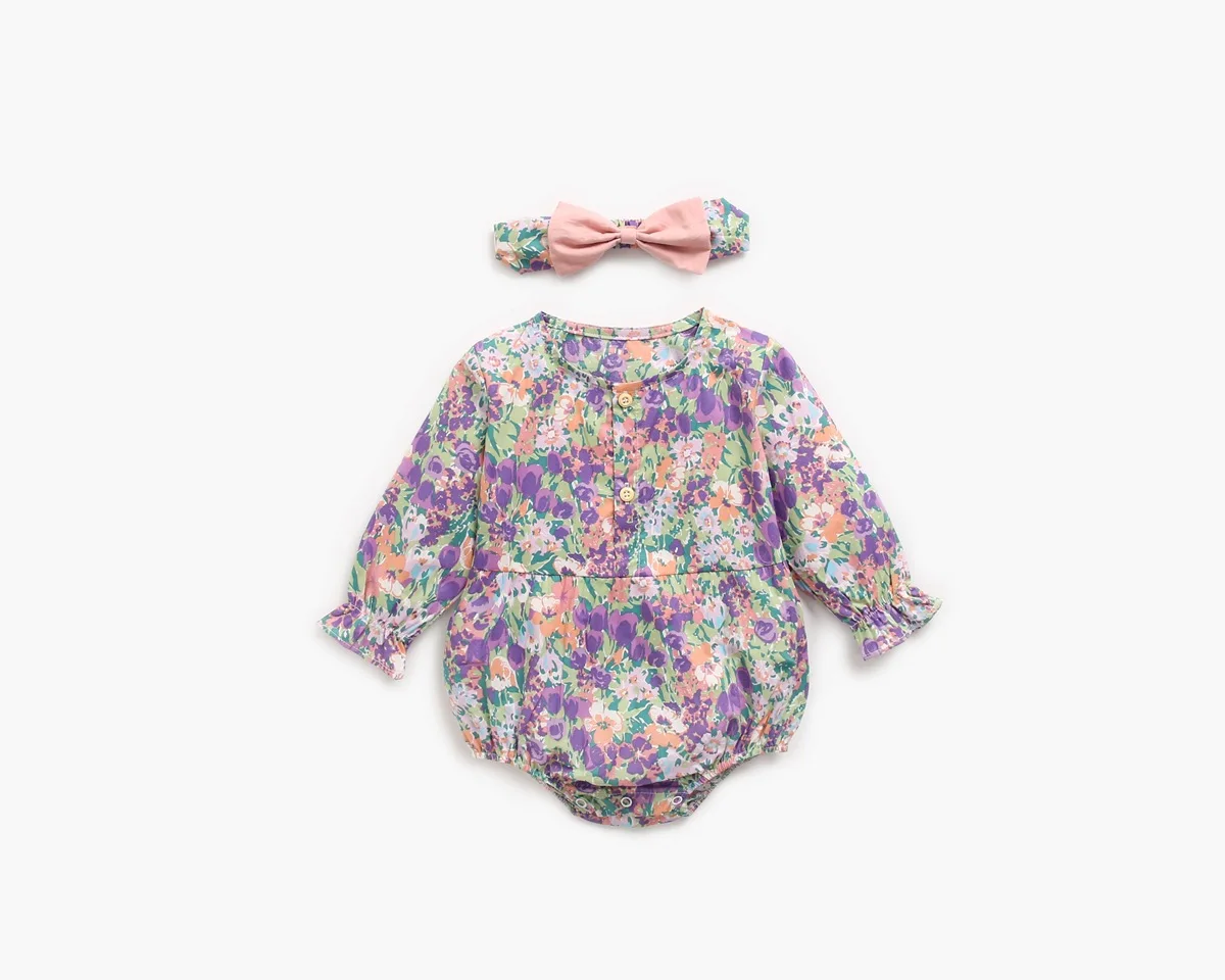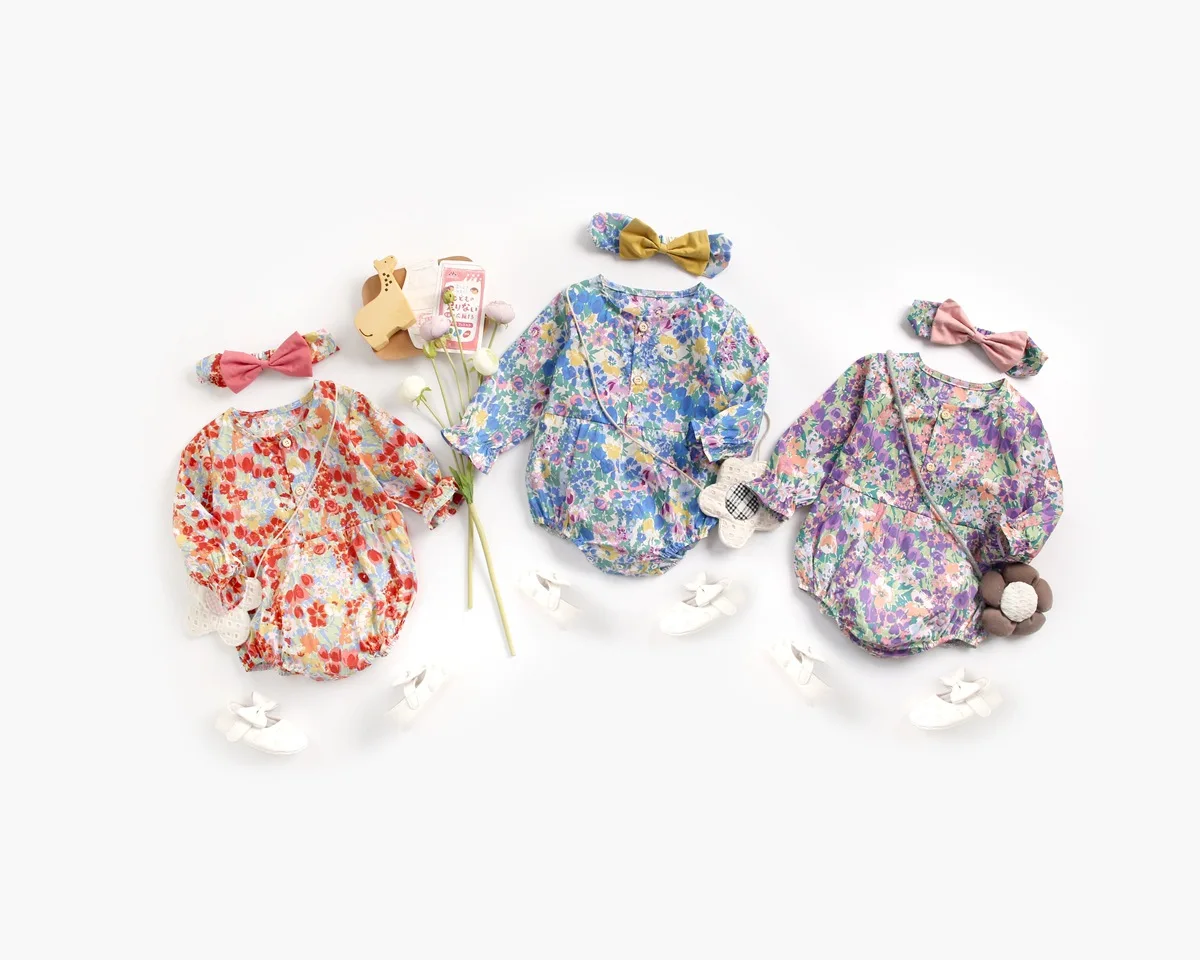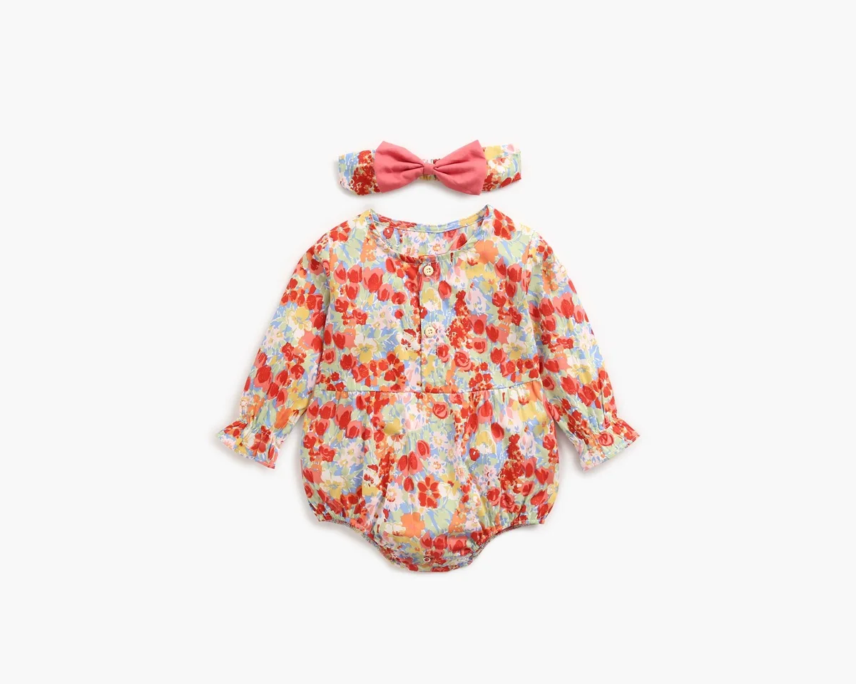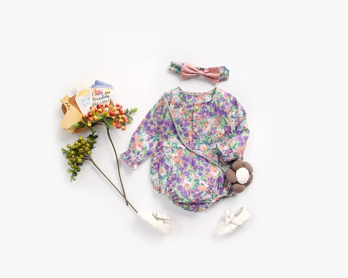 Осенний костюм для маленьких девочек, одежда боди с длинными рукавами и цветочным принтом для маленьких девочек + повязка на голову, одежда для детей 0-2 лет