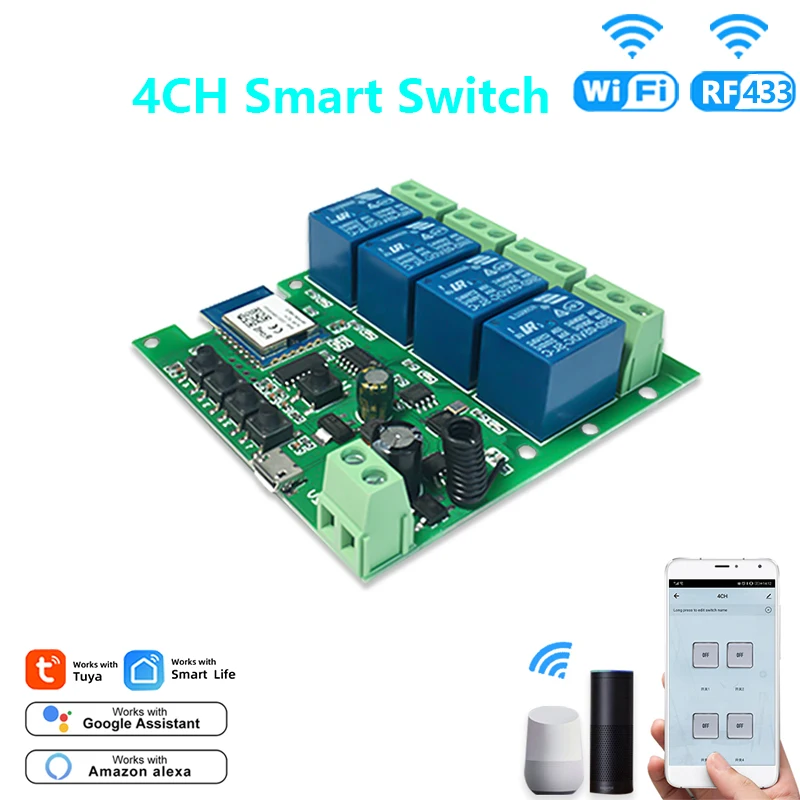 Умное импульсное реле 4CH Tuya, 4-канальный модуль переключателя Wi-Fi, 5 В, 7 в, 12 В, 24 В, 32 В постоянного тока, радио RF433, дистанционное управление через Alexa,Google