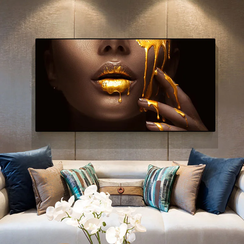 Картина большого размера с золотыми сексуальными губами, африканская черная женщина, Картина на холсте, картина маслом, Настенная картина, плакат, современный Декор для дома