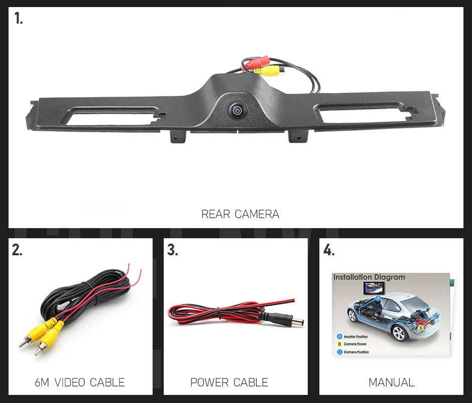 1. Задняя камера2. Коробка для посылка3. Видео кабель (6 м)4. Кабель питания5. Руководство пользователя