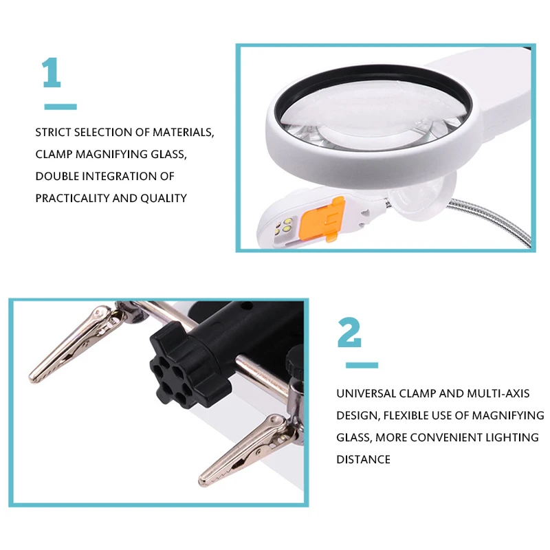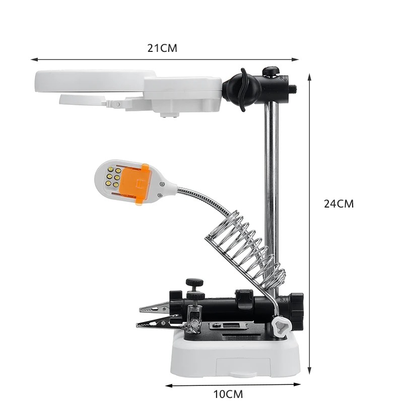Особенности:-3 вида увеличительных линз: Лупа с 3 лупами идеально подходит для пайки, строительных моделей, ремонта электроники, проектов «сделай сам», украшений, хобби и поделок. В то время как вспомогательный точечный объектив 4,5x и Вспомогательный объектив 25X добавляют дополнительного масштаба, когда вам нужно увидеть более замысловатые детали.-Регулируемые дужки: настольное увеличительное стекло с вращающейся на 360 ° шейкой и сгибаемыми дужками позволяет регулировать линзу в нужном вам месте, более того, опорные зажимы и зажимы типа крокодил регулируются, поэтому вы можете чувствовать себя более удобно и комфортно при использовании.-Суперъяркая: Лупа оснащена 10 Супер яркими светодиодный дами, обеспечивающими равномерно освещенную зону обзора даже в условиях низсветильник ности. Индикатор работает от 3 батареек AAA (не входят в комплект) или источника USB, например блока питания или розетки.-Прочность и стабильность: полностью регулируемые ручки с зажимом и зажимами типа крокодил, железный держатель, металлический лоток, 3 ящика для инструментов и более стабильное основание, легко регулировать высоту и ширину, Эта рука позволяет вам полностью сосредоточиться на выполняемой Вами работе, не беспокоясь о том, что инструмент наклонится или переместится.-Широкое применение: Полезный инструмент для пайки, строительных моделей, сварки, сбора штампов, ремонта электроники, проектов «сделай сам», ювелирных изделий, биологического наблюдения, хобби, поделок и т. д.
