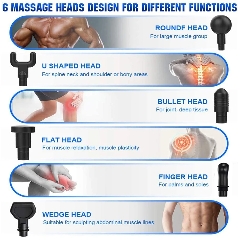 1 * массажный пистолет 1 * шариковая Массажная головка (используется для восстановления больших мышц) 1 * спиральная головка (для суставов человека) 1 * u-образная головка (для массажа позвоночника и сухожилия) 1 * Маленькая плоская головка (для расслабления мышц всего тела) 1 * головка лопаты (для шейного отдела позвоночника и спины) 1 * головка большого пальца (глубокий массаж мышц всего тела) 1*2400 мАч литий-ионный аккумулятор 1 * зарядное устройство 1 * Руководство пользователя на английском языке 1 * сумка для массажа