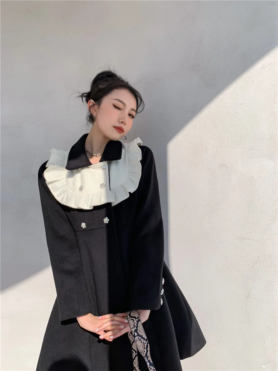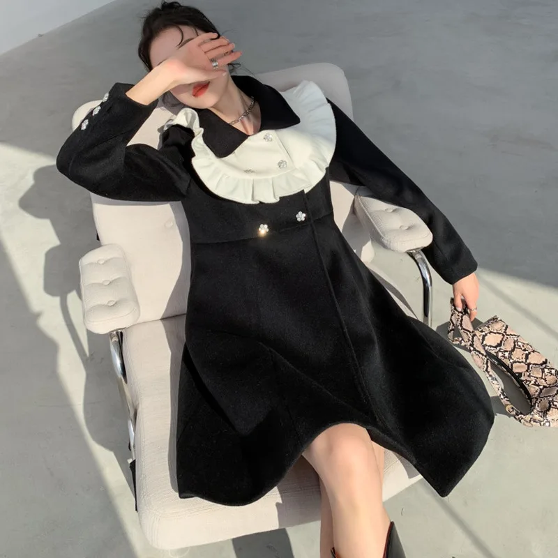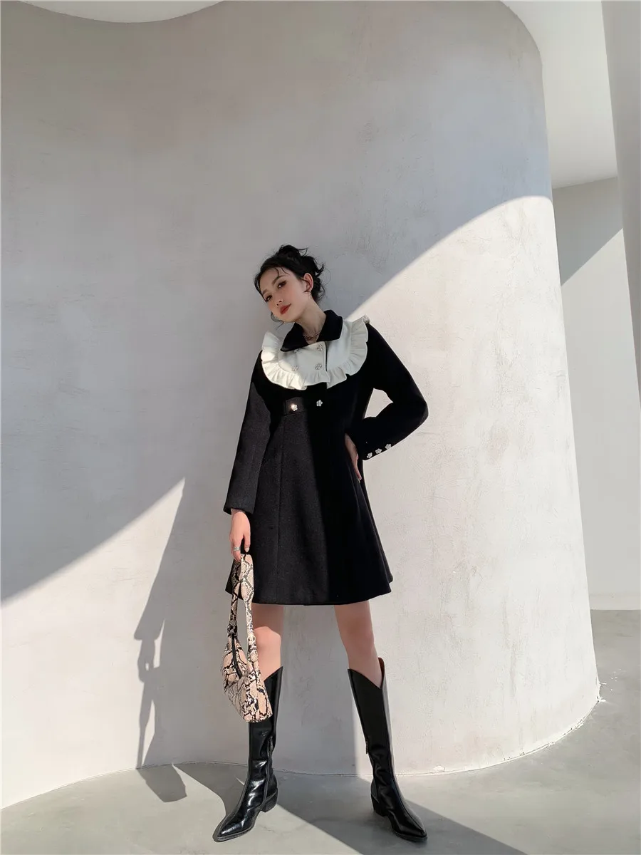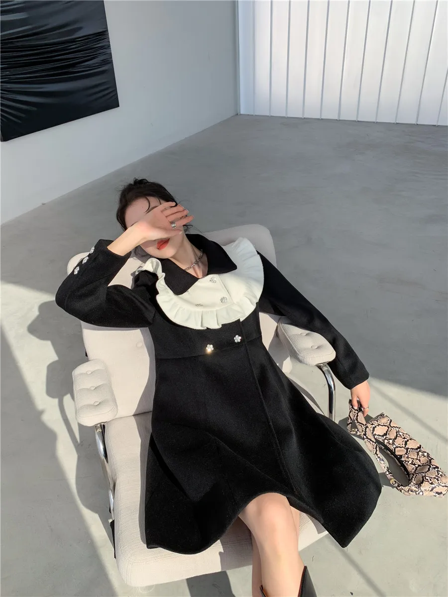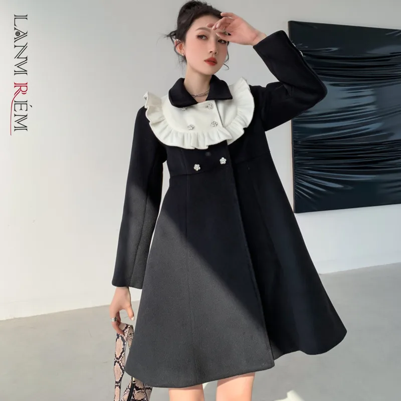 LANMREM 2021 Ранняя весна винтажное темпераментное платье с длинными рукавами стильное черное шерстяное пальто с двумя пуговицами для женщин 2A3168