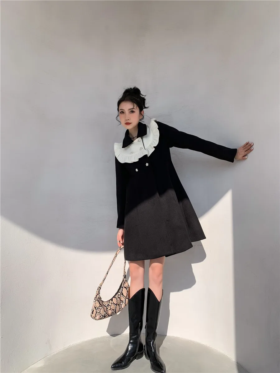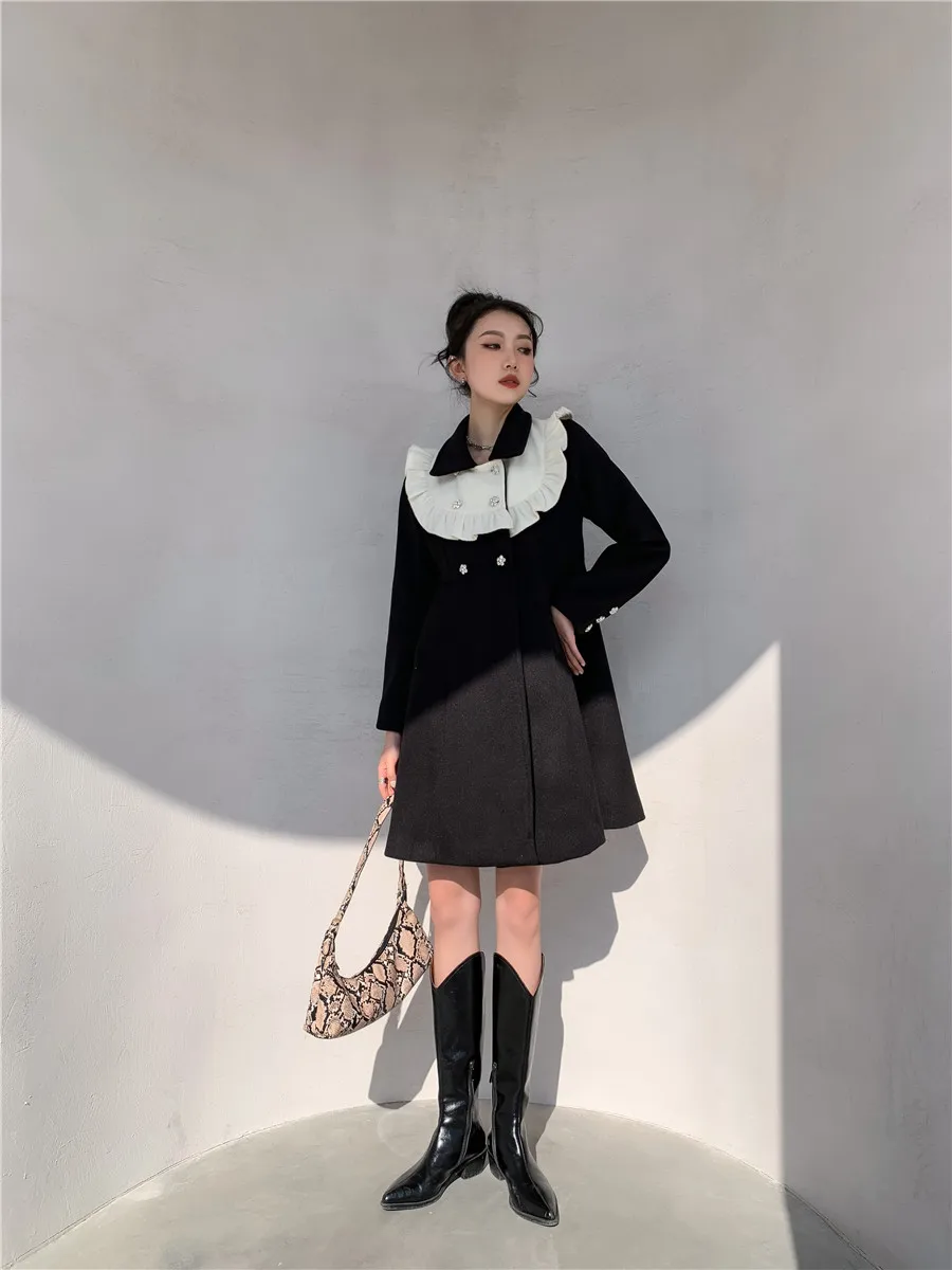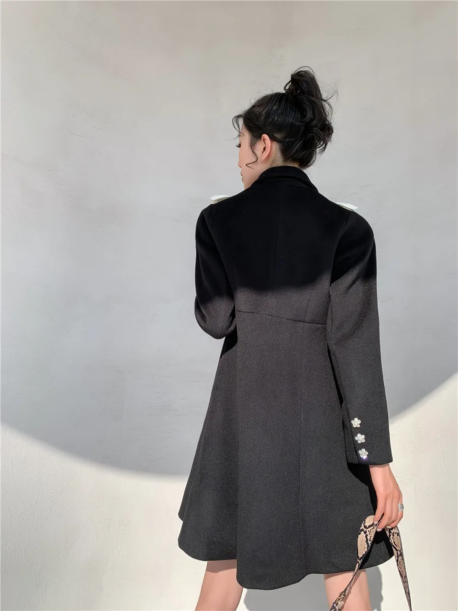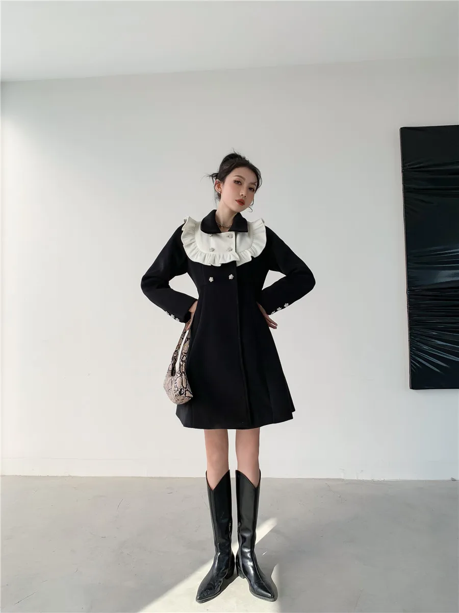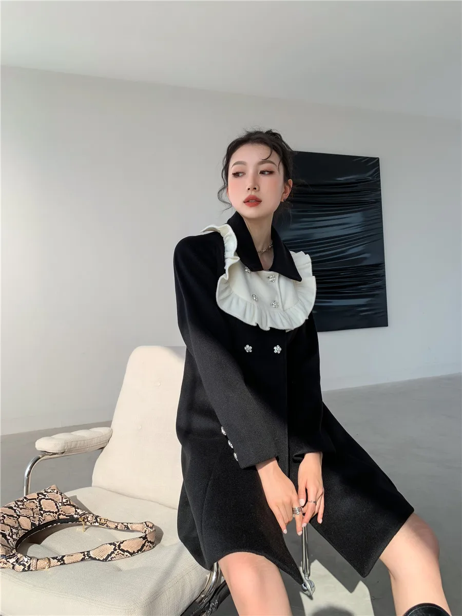 LANMREM 2021 Ранняя весна винтажное темпераментное платье с длинными рукавами стильное черное шерстяное пальто с двумя пуговицами для женщин 2A3168