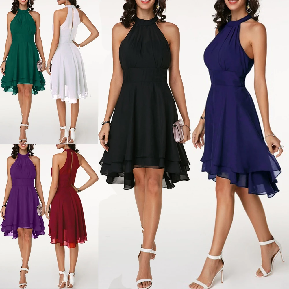 Женское шифоновое платье без рукавов, летнее однотонное укороченное вечерние нее платье с лямкой на шее, Повседневное платье до колен с круглым вырезом, размера плюс