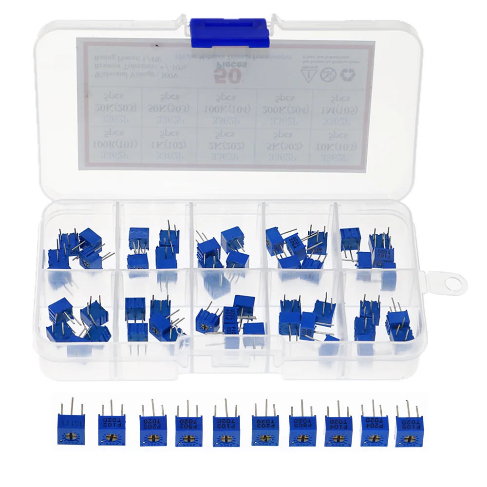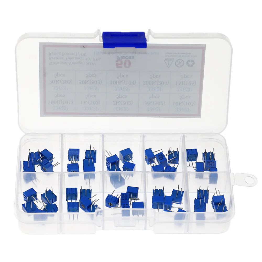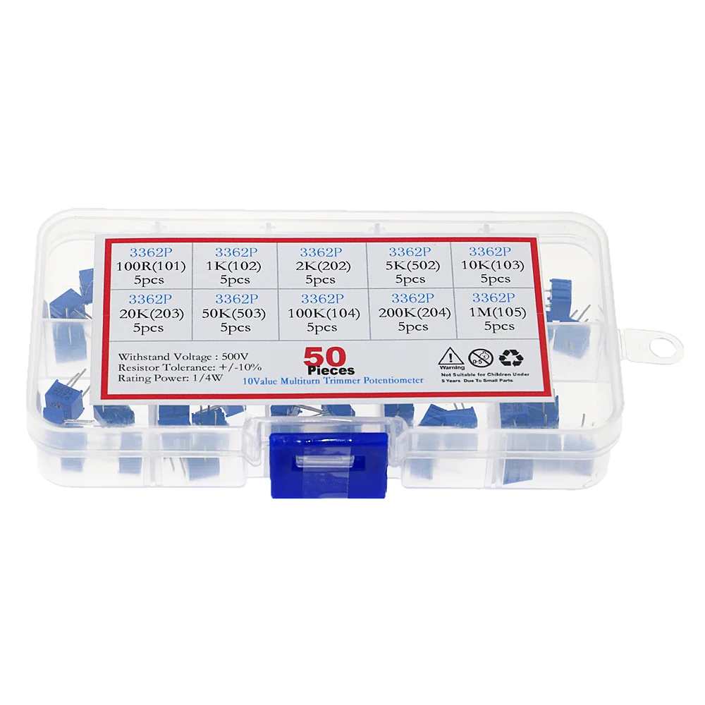 50 шт.лот 100 ohm-1Mohm 3362P потенциометр Ассорти Комплект 10 значений переменный резистор подстроечный потенциометр электронные резисторы пакет