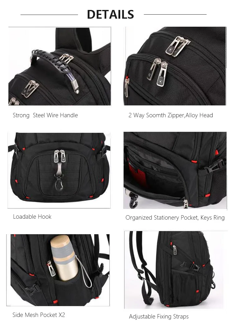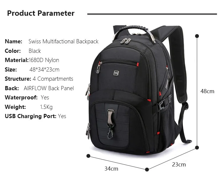 Вес: 1,5 кг (3.6lb)Рюкзак очень хорошего качества, можно купить.Материал: нейлон 1680D и Терилен/водонепроницаемыйКостюм: ноутбук 10-17 дюймовРазмер: 490*350*240 ммПряжка: Пряжка NIFCO на десять летСтруктура: ММножество отделений с множеством скрытых кармановКонфигурация: канцелярские сумки, компьютерные кабели, сетчатый карман, usb-порт для зарядкиПередовые тканиСтандартная конфигурацияУплотненный и расширенный ремешокЗадняя часть воздушного потока