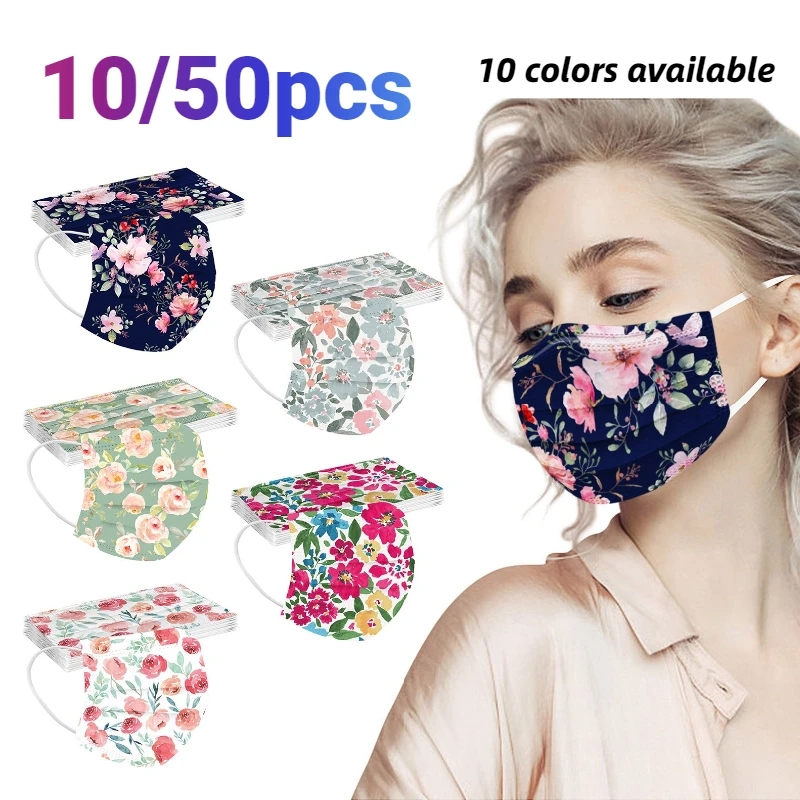 10 шт., одноразовые маски для лица с цветочным принтом для взрослых