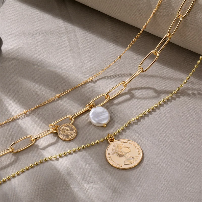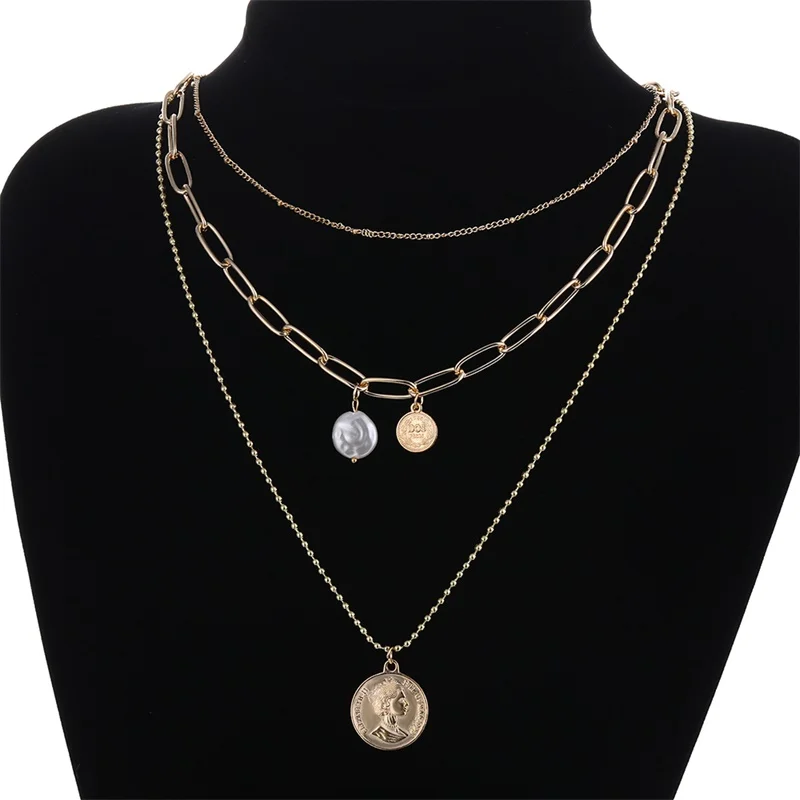 Винтажное многослойное Ожерелье Портрет с жемчугом Женская монета Женский портрет многослойное ожерелье с подвеской цепочка для Свитера Подвеска ювелирное изделие