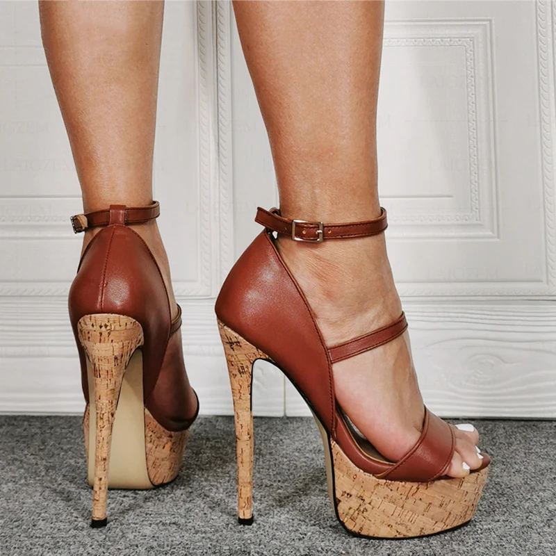 LAIGZEM Women Platform Sandals Strappy Faux Leather Ankle Strap Pumps Ladies Stiletto High Heels Shoes Woman Big Size 41 44 47 52