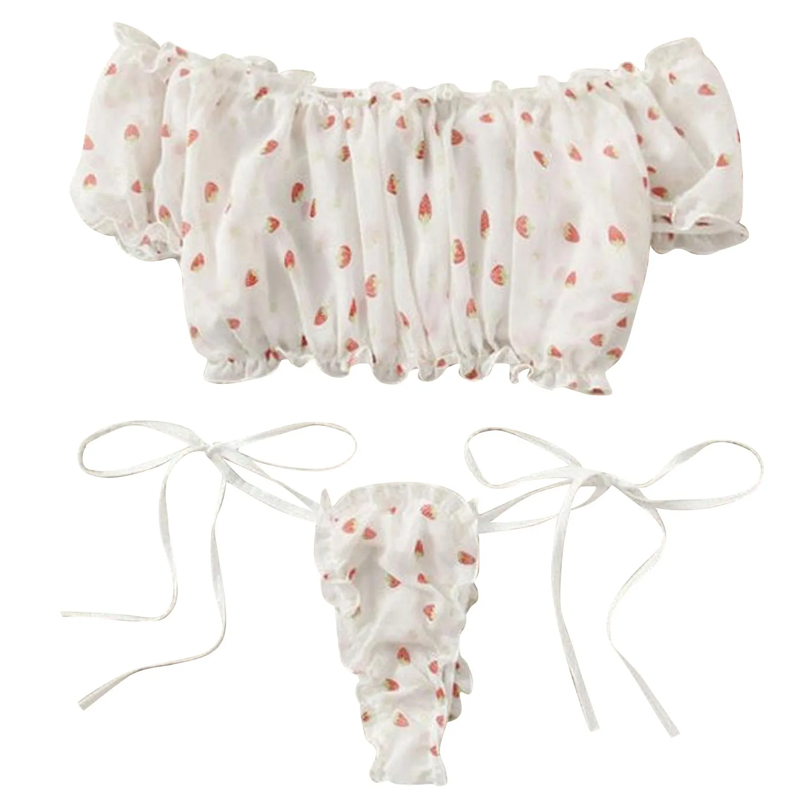 Женское каваи белье с принтом клубники симпатичное экзотическое нижнее белье бант сетка с открытыми плечами укороченный топ стринги комплект ночное белье