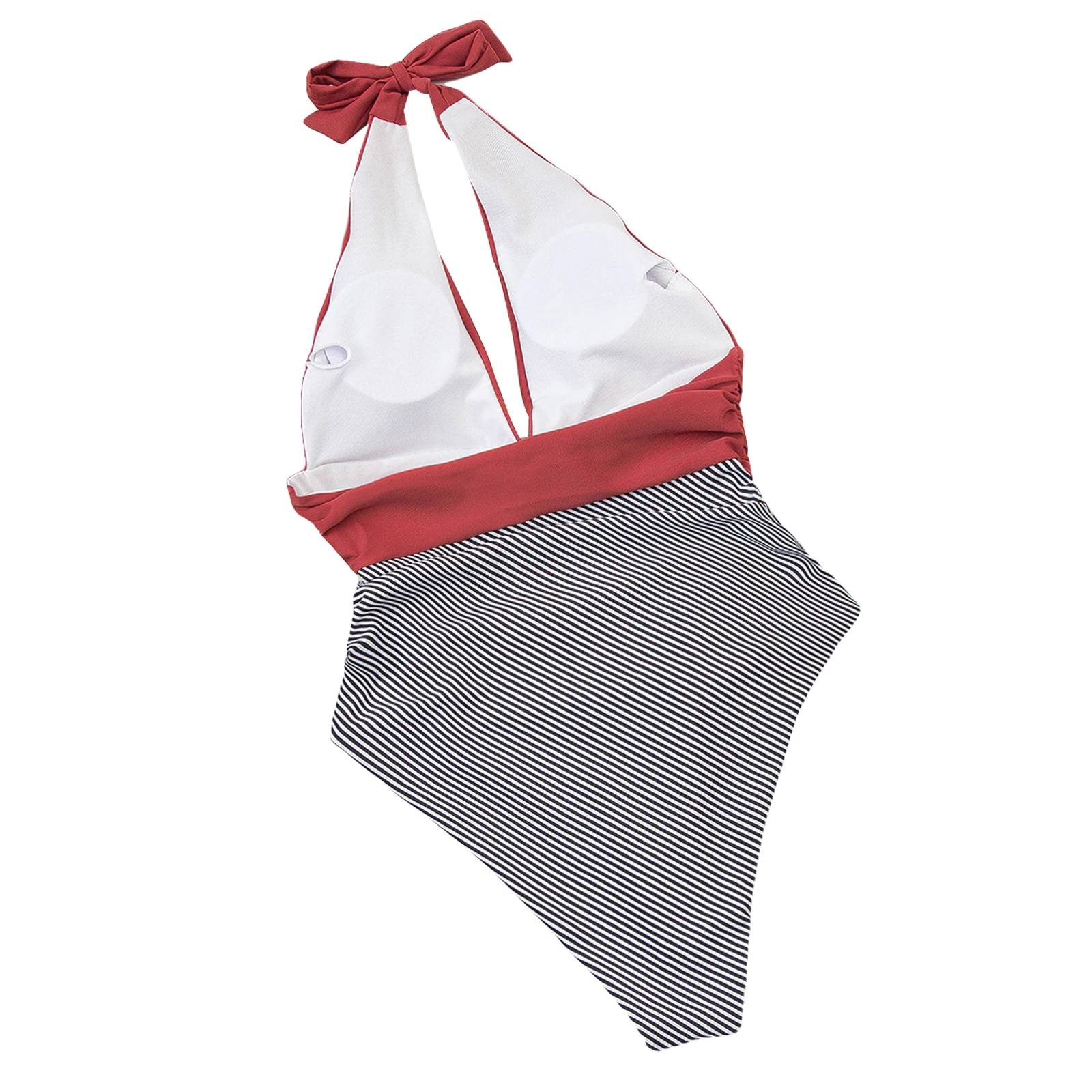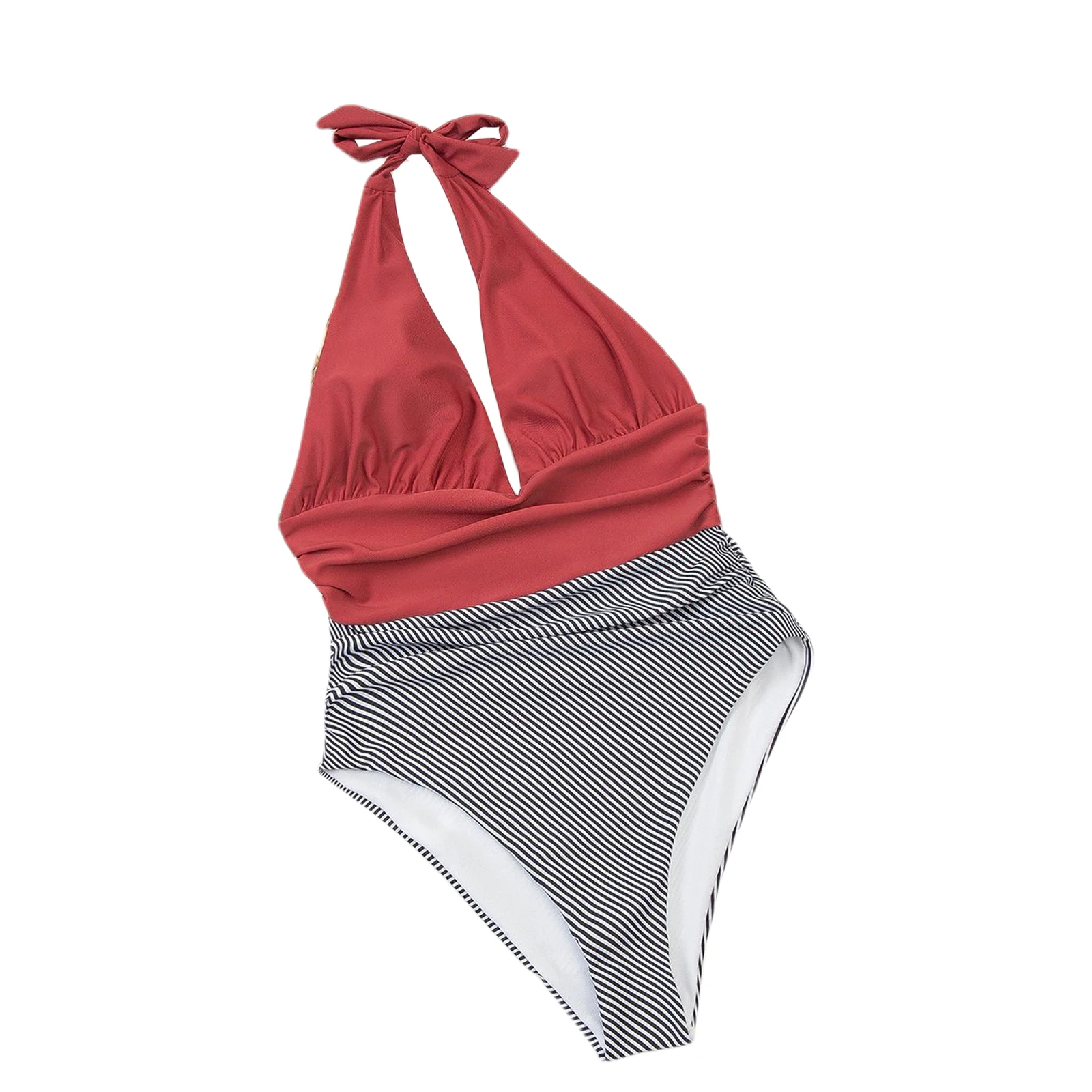 Винтажный слитный купальник в полоску в стиле пэчворк, женский бикини с высокой талией, комбинезон с открытой спиной, без рукавов, на шнуровке, пляжная одежда