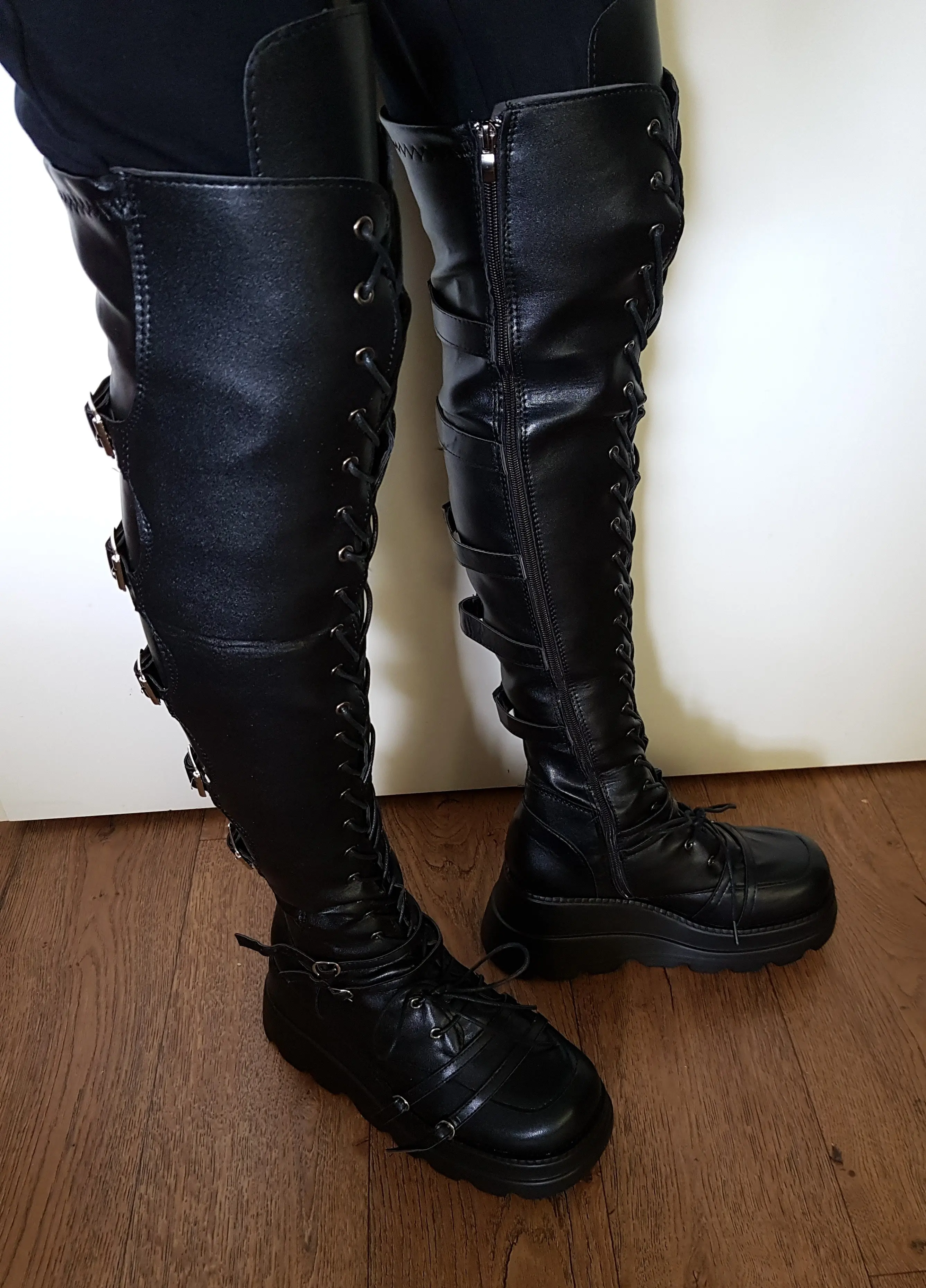 Женские ботинки до бедра, мотоциклетные ботинки на танкетке, на шну...