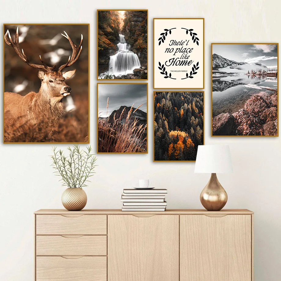 Настенная картина с изображением леса, гор, осени, оленя, листьев, ...